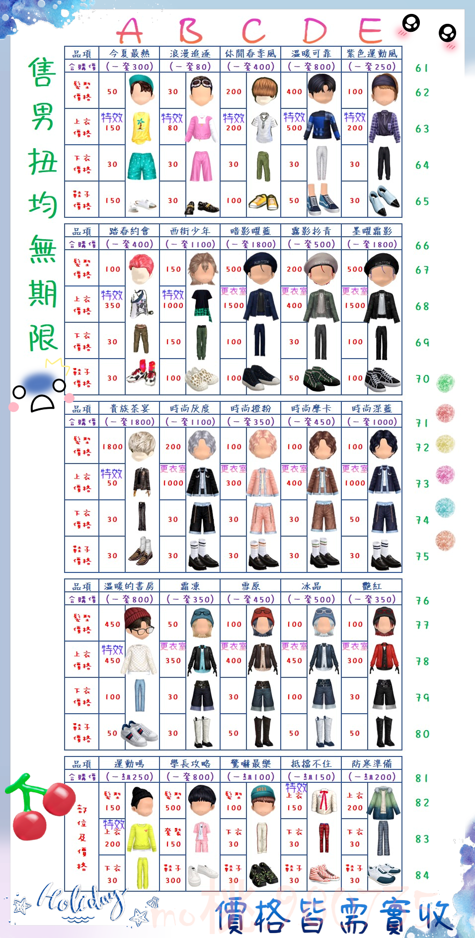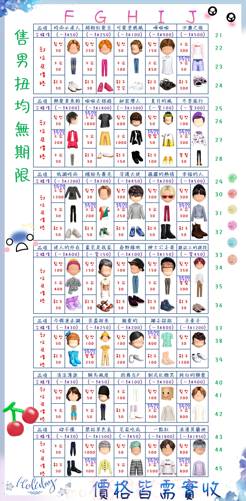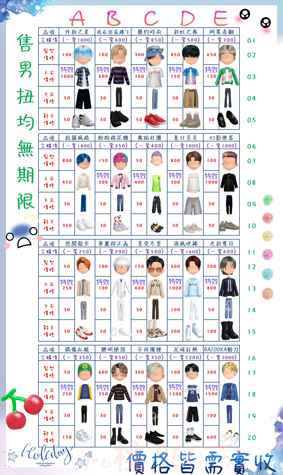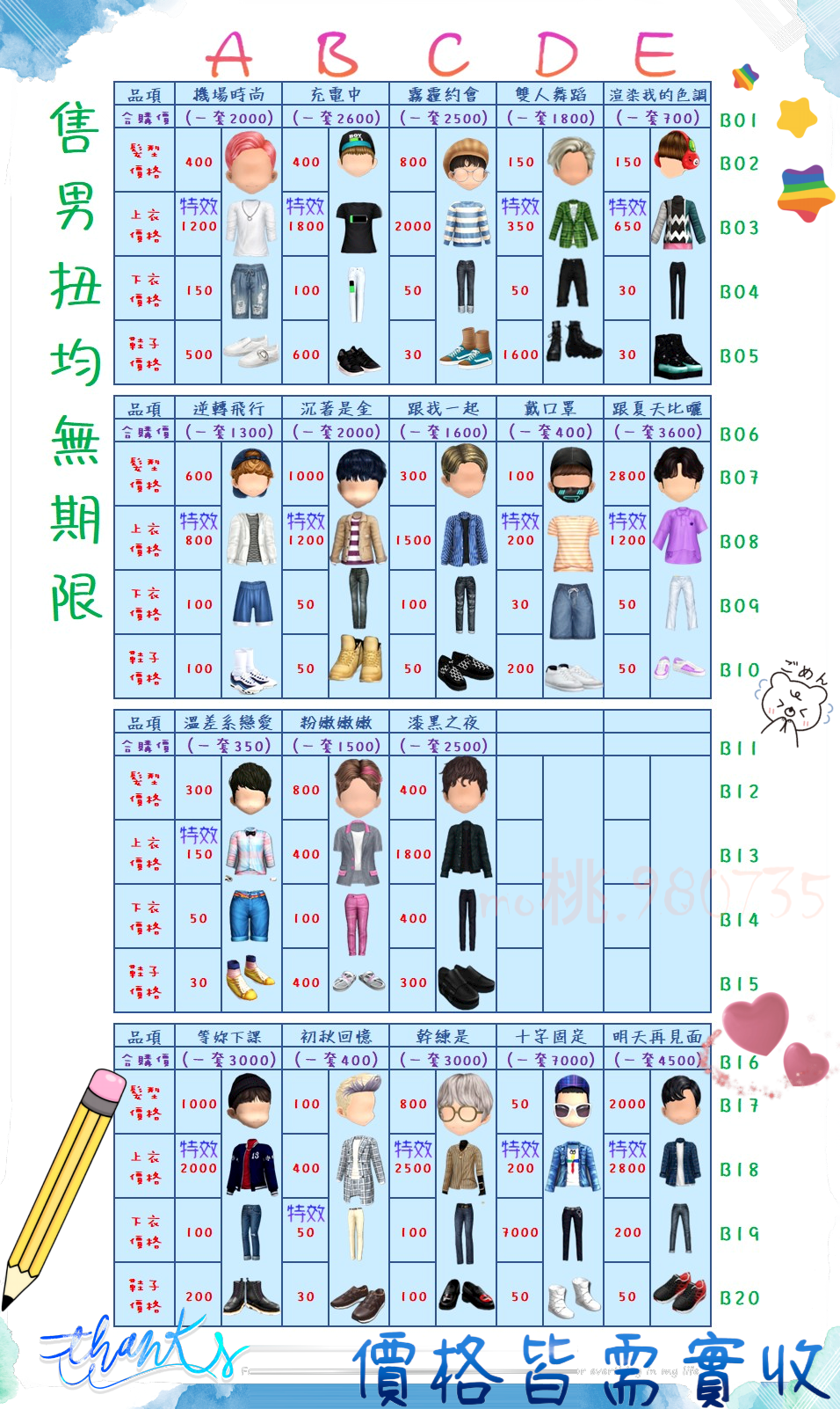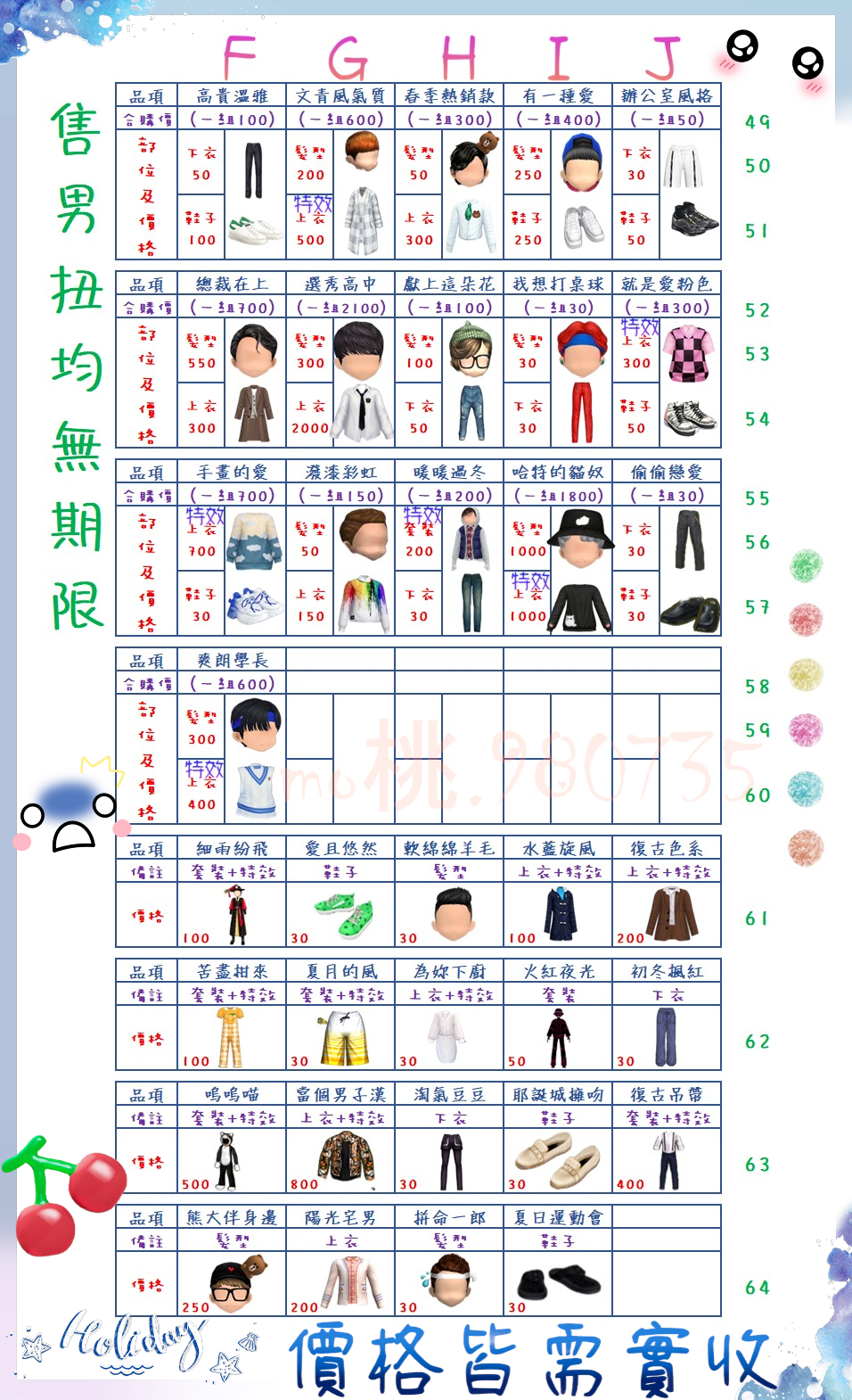 價格都是需要實收,另請先告知男生還女生的在附上編號!