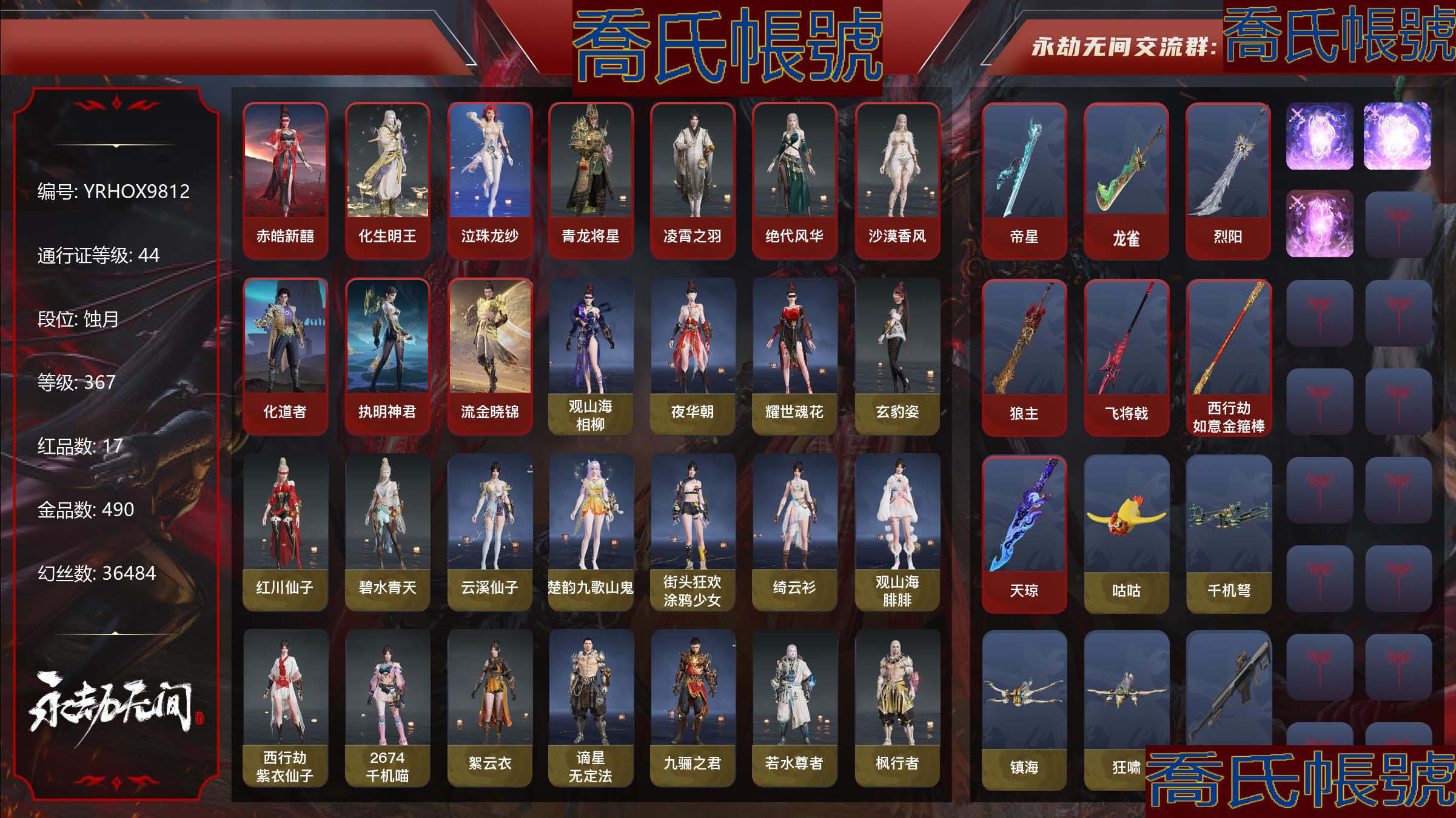 【YJYRHOX981211】17紅490金|等級367|蝕月|幻絲36484|金磚395|通行證Lv.44 紅色神品:赤皓新囍,化生明王,泣珠龍紗,青龍將星,凌霄之羽,絕代風華,沙漠香風,化道者,執明神君,流金曉錦,帝星,龍雀,烈陽,狼主,飛將戟,西行劫·如意金箍棒,天瓊 角色金色皮膚:觀山海·相柳,夜華朝,耀世魂花,玄豹姿,紅川仙子,碧水青天,云溪仙子,楚韻九歌·山鬼,街頭狂歡·塗鴉少女,綺雲衫,觀山海·腓腓,西行劫·紫衣仙子,2674·千機喵,絮雲衣,謫星·無定法,九驪之君,若水尊者,楓行者,八寶龍王,開闢鴻蒙·風雨諧,智繪·萍之緣,新倩女幽魂·瑤光沐月,新倩女幽魂·流紈裙,怪誕狂想·友情歲月,鬥羅大陸·唐三,銀狼裘,噬月天狼,追獵,不良人·李星雲,巫師3·傑洛特,逆水寒·染煙,觀山海·夏神祝融,龍心熾焰,洛天依·星空投影,長歌詩韻·遣唐使,夏日派對·高校水著,輝燁少女,陰陽姬,清雅少女,狩獵都市·暗夜利刃,決戰平安京·神罰之光,陰陽師·赤影妖刀姬,妖刀姬,觀山海·文鰩,開闢鴻蒙·金戈止,複製體·尼爾,弘毅袍,龍之影·過江龍,輝光,P5R·雨宮蓮JOKER,封神錄·申公豹,司天命,幽篁山鬼,朝聞道,玉衡天君,若谷,通玄,祿運玉霄,夏日派對·仲夏霜華,禍津素盞,麟鹿大鎧,花之傾奇,獅子丸,長歌詩韻·胡旋女,觀山海·青鳥,神鷹之女,龍門·飛天,花無痕,蜃樓魅影,瀚海蒼鷹,福瑞天澤,葫蘆兄弟·蛤蟆頭領,觀山海·秋神蓐收,西行劫·悟空,英雄袍,觀山海·冬神玄冥,護世四法·廣目天王,黃昏巫主,卷王,夜綢袍,正法袍,雲間影,雪鈴綺歌,狩獵都市·雷行獵手 髮型金色皮膚:(挑染)泠川發,簪纓發,(挑染)雲霞發,百靈發,韶光發,(挑染)自在發,緣覺發,子菀發,蘇木發,伏苓發,鬥羅大陸·海神發,逆水寒·江海發,觀山海·炎野發,逆水寒·染髮,巫師3·白狼發,不良人·三聖涅發,月丹發,月下香發,洛天依·洛紀元發,碎浪發,安瀾發,(挑染)填海發,立靖仇驗發,竹律發,(挑染)冰羽發,排霜發,夕鷹發,龍門·化羽發,觀山海·青鸞發,翔鸞發,西行劫·大聖發,觀山海·天刑發,流螢發,觀山海·冥泉發,(挑染)霧灼發,古溪發,驚雀發,秀逸發,(挑染)獅鬃發,(挑染)玄冥發,(挑染)風吹雪發,蜜語發,(挑染)牽雲霞發,狩獵都市·迅猛發 武器金色皮膚:咕咕,千機弩,鎮海,狂嘯,沉默審判,戲祥雲,引冰落,金蠍,玉飛梭,螢火,獵獁銃,石中火,雪國禮炮,兔華籠,鑽山,觀山海·嘉果花,造景,墨雙戟-不歸,火羅衛,龍嘯,丹鶴,赤霞,虎踞,爐中火,烏木弓,逆逢,轉輪弓,仙毫,青花,春水,蓮心劍雨,炎魔,鎮惡,2674·原型,不良人·龍泉劍,巫師3·湖女之劍,琴心,隱鋒,監星尺,複製體·月光與黑暗,西行劫·紫金寶劍,壺中日月,含光承影,醉花風,數珠丸,燭淚,斬銀河,塑夢鑰匙,青石猊,龍蟠,山君怒,決戰平安京·不祥緋刃,聽濤,星輝環月,觀山海·朱明,神龍刀,鬥羅大陸·海神三叉戟,觀山海·金神鉞,通天戟,銀鐮槍,焦鈺,長虹,雪夜·清光引,建木,委蛇矛,白虹,糖果棍,護世四法·降魔,學宮之杖,倒馬棍,戒律杖,判官筆,曼提柯爾之牙,橈尺刀,仙舞,破劫·千刃,青峰疊扇,騰雲歌,耀夜流華,逍遙,咯咯,傲骨,月瞳,嘶風,除歲,法持,玉矩,精武,詭月,武道無窮·雙蝶,無救,天威,天之刑,絕潮汐,破重雲,觀山海·水衡 飾品金色皮膚:白菜頭,劫杯·戰神,玄陶俑面·女,目瞪馬呆·女,雁落笠,暖冬帽·女,美團·團上頭了,輝晶星辰,系雲瀾,觀山海·腓耳,2674·北海巨喵,2674·心尾,炎流雲禪笠,玄陶俑面·男,目瞪馬呆·男,暖冬帽·男,魔燭帽,硯臺,天狼盔,雪鹿雄角,福虎帽,洛天依·資料耳機,浮元子,立烏帽,銀姬小帽,鐵護臂,暗香,安歌帽,鮫人角,雪鹿雌角,華夏寶甲·歸正,癸卯兔,麟鹿兜,蒼鷹之羽,虎絨耳,葫蘆兄弟·蛤蟆頭,觀山海·秋金,觀山海·冬稜,醉狐銀,繃帶頭套,金瑛冠,盜墓筆記·防風帽,開闢鴻蒙·凜寒星,鹿鈴角,晝百合,狩獵都市·碎空龍尾 變身器:2674·初代機,龍門·石龕造像,彩俑娃娃,剪紙·彩刀,荊魂,西行劫·神君印,千秋匠心·兇虎,攬九天 【代幣或期限道具請以實際驗號為準】【Steam】【國服】三孔謫星大佛,烈陽,八個變身器,全是高質量皮膚,先到先得
