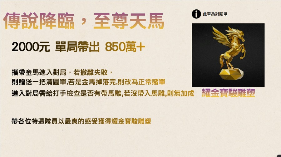 第一局打手給老闆起六套全裝,老闆進圖每殺一位特遣加 100萬保底(落地成盒安慰獎 300萬加保底)(放下屠刀立地成佛獎 500萬加保底 人機特遣0殺安全撤離)