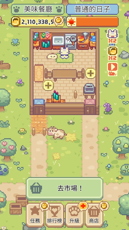 21億金幣 + 去廣告禮包 + 可愛的小雞禮包 + 可愛的牛禮包 + 貓速度X2禮包 + 銷售額X2禮包 = 400