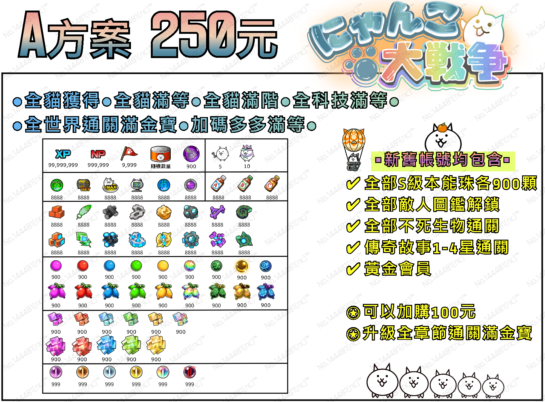 【A方案】全貓獲得 + 全貓三、四階滿等 + 設施滿等 + 全資源 + 全S級本能珠各900顆 + 多多滿等 + 白金帽10隻/助手5隻 + 全部敵人圖鑑 + 全世界通關滿金寶 + 傳奇1-4星全通 + 全部不死生物來襲通關 + 黃金會員 = 250T