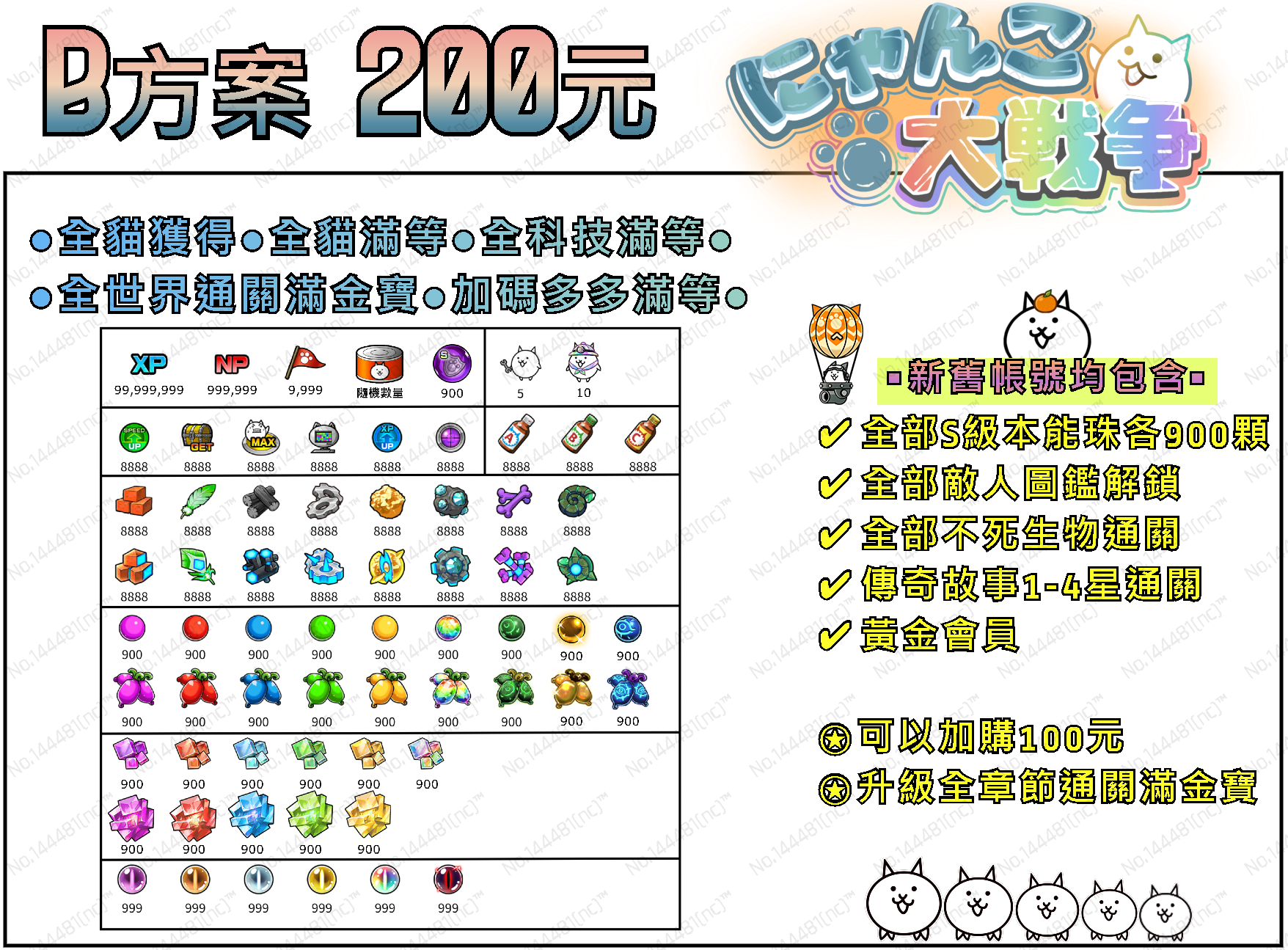 【B方案】全貓獲得 + 全貓滿等 + 設施滿等 + 全資源 + 全S級本能珠各900顆 + 多多滿等 + 白金帽10隻/助手5隻 + 全部敵人圖鑑 + 全世界通關滿金寶 + 傳奇1-4星全通 + 全部不死生物來襲通關 + 黃金會員 = 200T