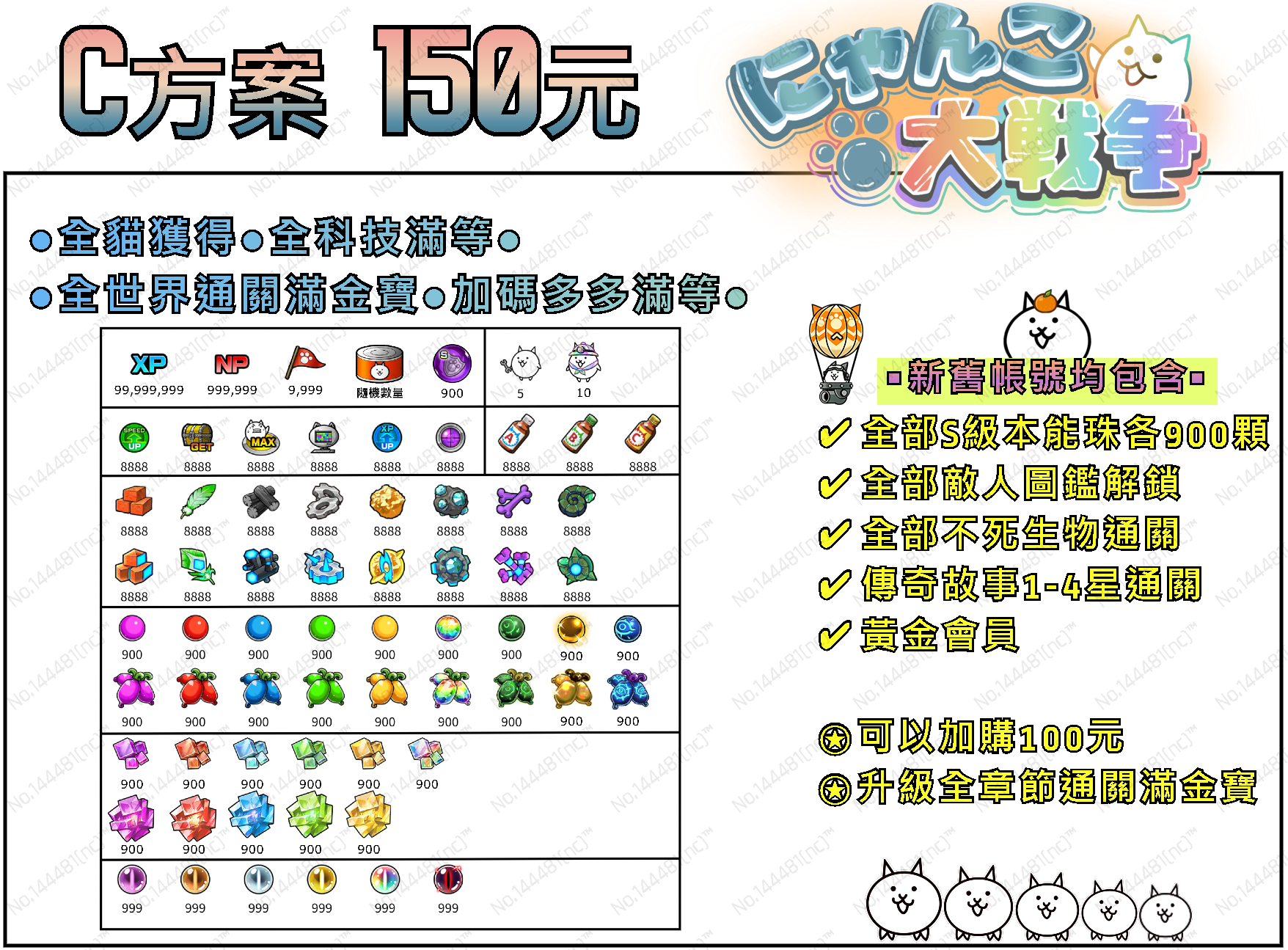 【C方案】全貓獲得 + 設施滿等 + 全資源 + 全S級本能珠各900顆 + 多多滿等 + 白金帽10隻/助手5隻 + 全部敵人圖鑑 + 全世界通關滿金寶 + 傳奇1-4星全通 + 全部不死生物來襲通關 + 黃金會員 = 150T