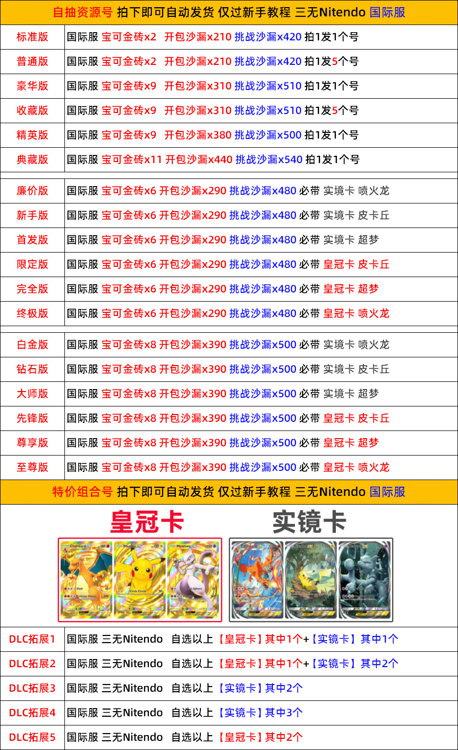 方案五:寶可金磚*6+開包沙漏*300+挑戰沙漏*480(「必帶皇冠卡」 皮卡丘or超夢or噴火龍 三選一)➡️299$