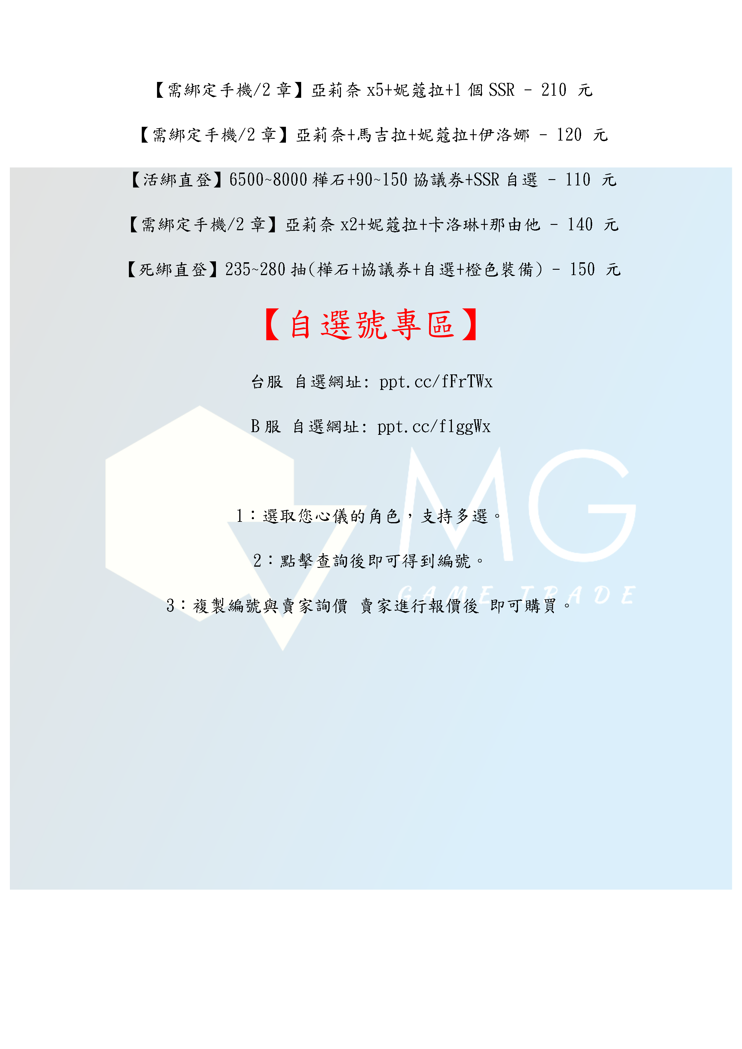 帳號 【初始號】 【MG數碼】 台服 日服 陸服 多抽號 初始號 自抽號 自選號 自選組合
