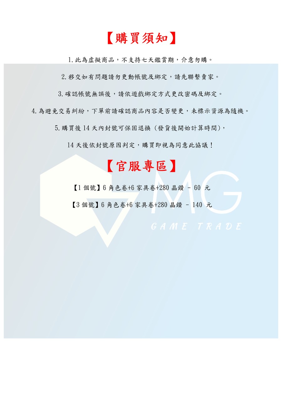 1.此為虚擬商品,不支持七天鑑賞期,介意勿購。 2.移交如有問題請勿更動帳號及綁定,請先聯繫賣家。 3.確認帳號無誤後,請依遊戲綁定方式更改密碼及綁定。 4.為避免交易糾紛,下單前請確認商品內容是否變更,未標示資源為隨機。 5.購買後14天內封號可保固退換 (發貨後開始計算時間), 14天後依封號原因判定,購買即視為同意此協議!