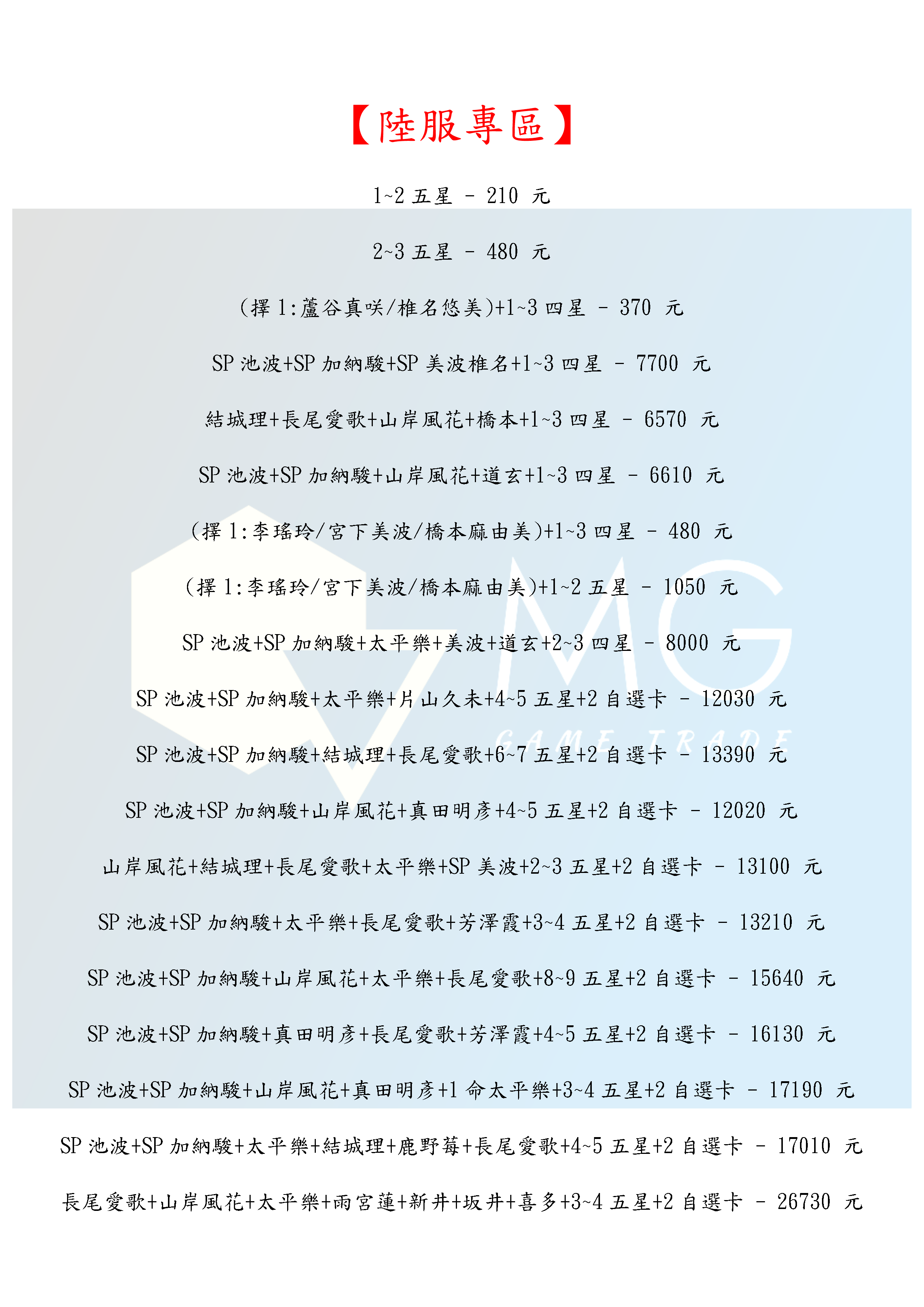 帳號 【初始號】 【MG數碼】 台服 陸服 韓服 多石號 多抽號 初始號 自抽號 自選號 自選組合