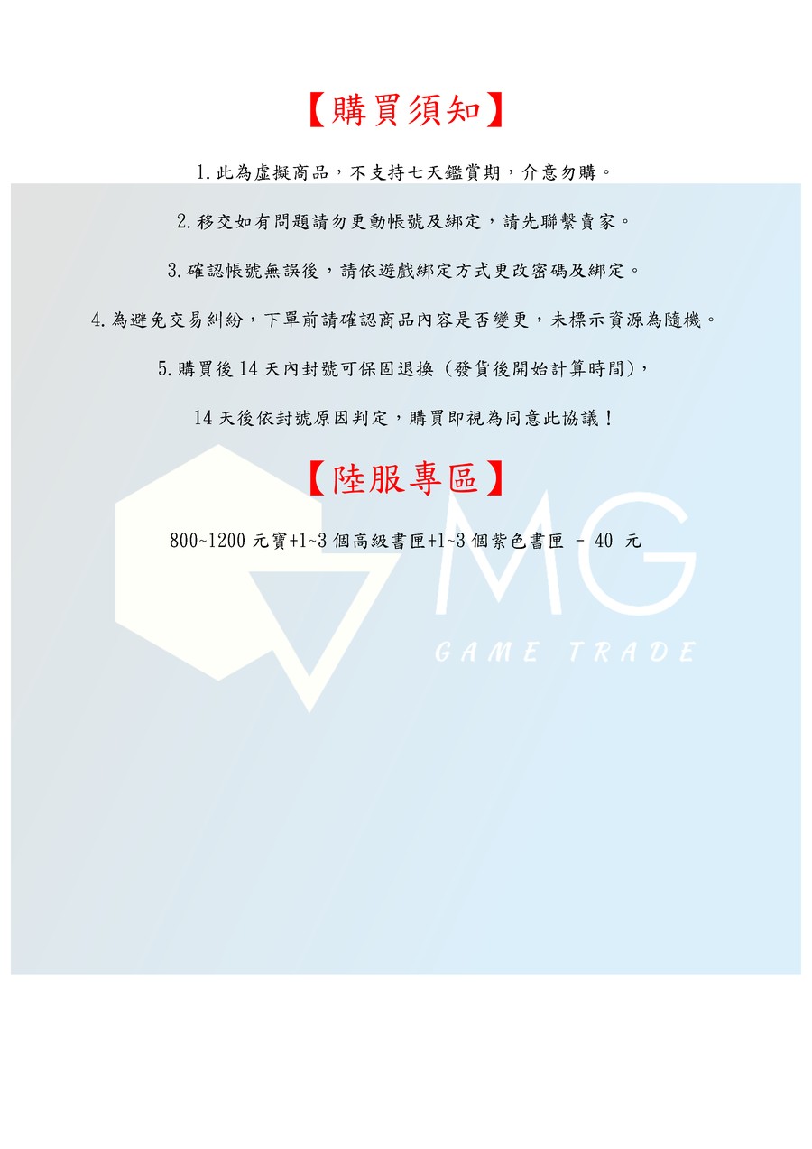 1.此為虚擬商品,不支持七天鑑賞期,介意勿購。 2.移交如有問題請勿更動帳號及綁定,請先聯繫賣家。 3.確認帳號無誤後,請依遊戲綁定方式更改密碼及綁定。 4.為避免交易糾紛,下單前請確認商品內容是否變更,未標示資源為隨機。 5.購買後14天內封號可保固退換 (發貨後開始計算時間), 14天後依封號原因判定,購買即視為同意此協議!