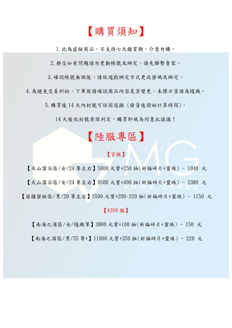 1.此為虚擬商品,不支持七天鑑賞期,介意勿購。 2.移交如有問題請勿更動帳號及綁定,請先聯繫賣家。 3.確認帳號無誤後,請依遊戲綁定方式更改密碼及綁定。 4.為避免交易糾紛,下單前請確認商品內容是否變更,未標示資源為隨機。 5.購買後14天內封號可保固退換 (發貨後開始計算時間), 14天後依封號原因判定,購買即視為同意此協議!
