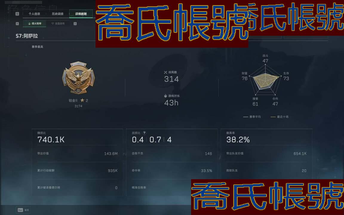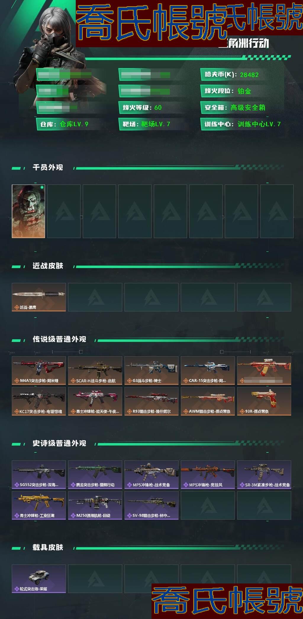 【OBSAGPG912842】總資產:241M,哈夫幣:2848W,武器皮膚:14,烽火60級:戰場8級:【安全箱】進階安全箱;【特勤處等級】倉庫LV.9,靶場LV.7,訓練中心LV.7;【幹員皮膚】紅狼電鋸驚魂;【近戰武器】近戰武器-黑鷹;【步槍皮膚】M4A1突擊步槍-阿米婭,SCAR-H戰鬥步槍-啟航,CAR-15突擊步槍-阿米婭,騰龍突擊步槍-撈點薯條,KC17突擊步槍-電鋸驚魂,SG552突擊步槍-深海恐懼,騰龍突擊步槍-獵鱷行動;【衝鋒槍皮膚】勇士衝鋒槍-能天使-午夜郵差;【狙擊步槍皮膚】R93狙擊步槍-維什戴爾,AWM狙擊步槍-撈點薯條,SV-98狙擊步槍-林中獵手;【輕機槍皮膚】M250通用機槍-囚徒;【手槍皮膚】93R-撈點薯條;(資訊源於賣家釋出,實際資訊以驗號為準)【QQ登入】****【烽火60級 總資產241.1M 現金28M 收藏室價值41M 紅狼電鋸驚魂 部門全3 體負7倉庫9 精品號】 【幹員外觀】:紅狼-電鋸驚魂 【近戰皮膚】:近戰-黑鷹 【傳說外觀】:M4A1突擊步槍-阿米婭,SCAR-H戰鬥步槍-啟航,G3戰鬥步槍-騎士,CAR-15突擊步槍-阿米婭,騰龍突擊步槍-撈點薯條,KC17突擊步槍-電鋸驚魂,勇士衝鋒槍-能天使-午夜郵差,R93狙擊步槍