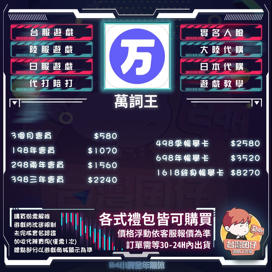 代儲【3個月會員=580元】 🔥萬詞王陸服🏆24H客服🏆現貨秒出🔥台灣囝仔❤️