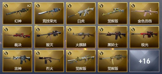 AWM-裁決,9A91-烈火,AK12-天啟,QBZ03-金色薔薇,AA-12-雷霆,AK47-機械迷城,黑武士-錦繡游龍,COP-墮天神,王者之影-覺醒版,M4A1-龍血,無影-神兵利器,閃光彈-雷暴,龍嘯,AK47-黑鯊,王者之怒,煉獄-悅藍-覺醒版,閃光彈-墮天神,閃光彈-雷霆,M4A1-黑龍,煙霧彈-夜魔,Barrett-毀滅,王者之鋒-覺醒版,死亡之眼,M4A1-黑騎士,AWM-天龍,M4A1-玫瑰精靈,雷霆之鋒,加特林-煉獄,馬來劍-夜魔,高爆手雷-夜魔,湯姆遜-烈龍,Barrett-極光,擎天,炫金武士,AK47-無影,煙霧彈-雷暴,王者之嘯-覺醒版,高爆手雷-雷霆,王者之幻,斬神刀-雷暴,AK47-B-戰神,高爆手雷-墮天神,煙霧彈-雷霆,煙霧彈-墮天神,麒麟刺-墮天神,AK47-黑武士,高爆手雷-雷暴,AK-47-猩紅傳說,天啟-悅智,龍嘯-墮天神,屠龍,M4A1-雷神,AK47-B-戰士,RPK-盤龍,M4A1-死神,Kar98K-星神,王者之勢,AK47-火麒麟,沙鷹-天神,M200-幻神,HK417-朱雀,閃光彈-夜魔,AN94-超新星,王者之魄-覺醒版,沙鷹-修羅,麒麟刺