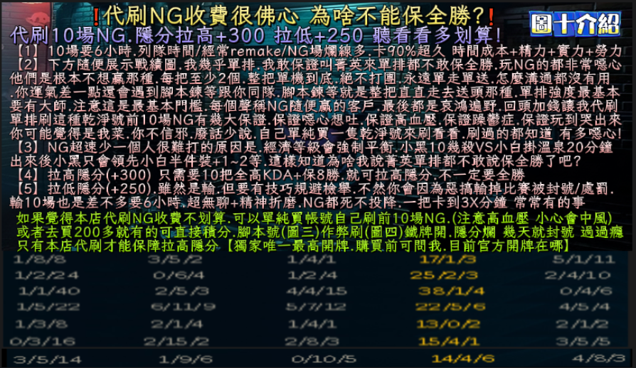 | 真手工代刷10場NG 好KDA+保8勝+6小時=拉高開牌隱分 |