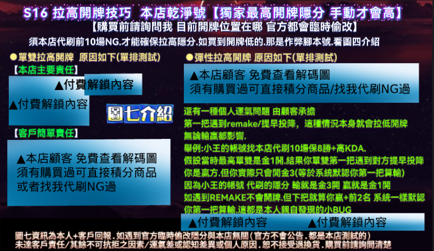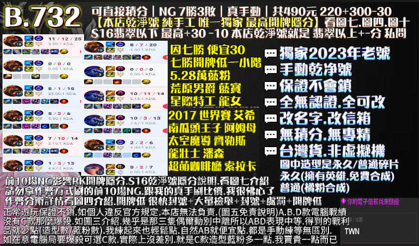 🔹獨家RK最高開牌隱分:手工代刷前10場NG 好KDA+保8勝+6H =拉高開牌