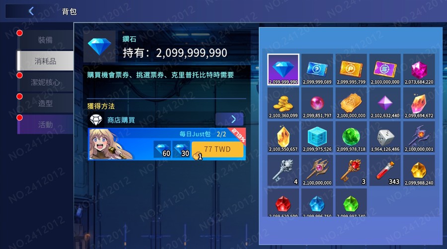 金幣 + 鑽石 + 密幣 + 木葉石 + 水霧石 + 烈焰石 + 絢陽石 + 靈魂石 + 量子塊 + 魯米諾 + 積分 + CP + 機會票卷 + 挑選票卷 + 技能票卷 + 技能強化石 + 量子珠 數量皆為 21 億|﹩私訊