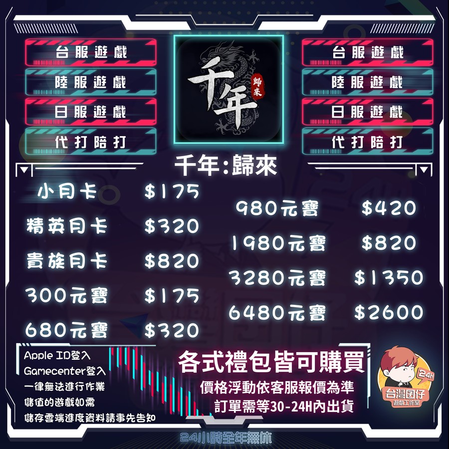 代儲【300元寶=175元】 🏆千年:歸來代儲🏆24H客服🔥台灣囝仔🔥退刷包賠