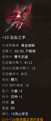 道具 ※ 槍騎士專用槍騎武器 :+10浴血之矛(吸取體力掛機練功最實用)