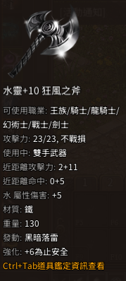 道具 ※ 王/騎/龍/幻/戰/劍職業魔法武器 :+10狂風之斧(魔法發動:黑暗落雷)