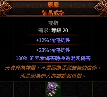 道具 【戒指、飾品】 傳奇PoE2👌原罪.紫晶戒指 (100% 的元素傷害轉換為混沌傷害 )