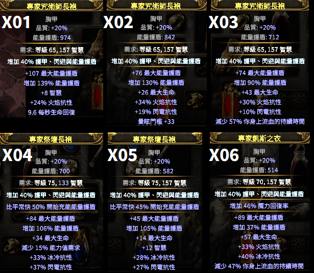 道具 【胸甲、標準、ES胸甲】 %能量護盾 火抗 電抗 冰抗 電法 風暴X