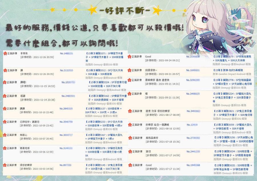 👉老闆娘原本在台灣8591出售多年陰陽師帳號,因私人理由重新開設帳號重售,最新組合可以小窗查詢~給最優惠的價錢給大家,只要你來問,有興趣的組合,老闆娘我一定會給你最甜的價!