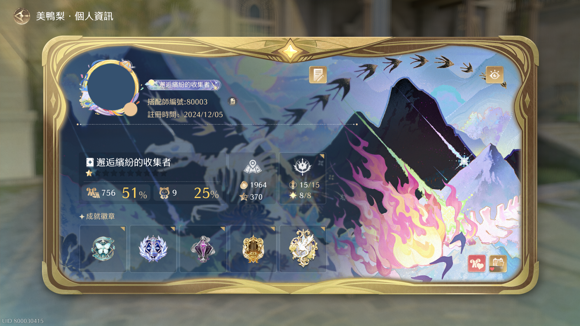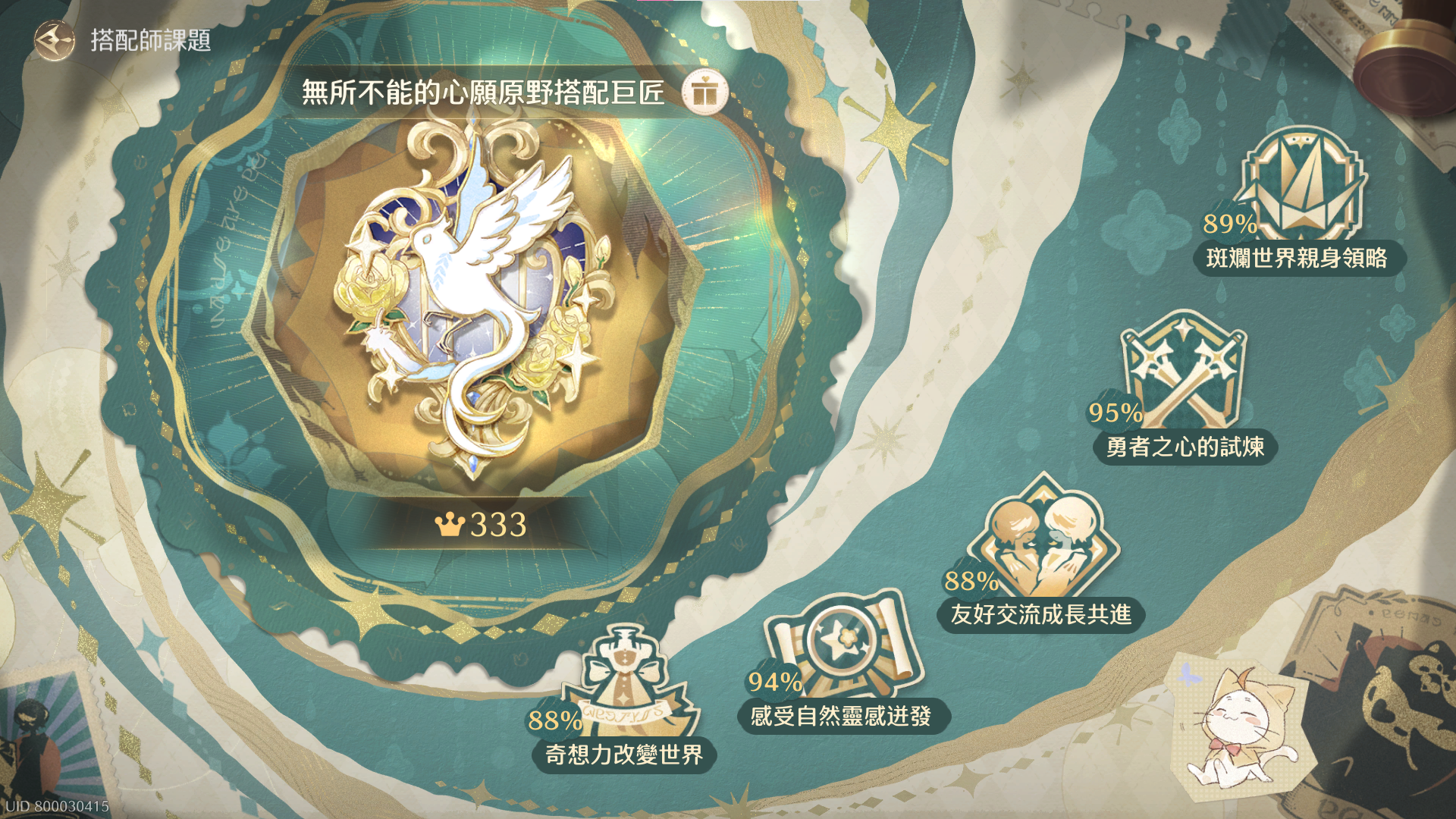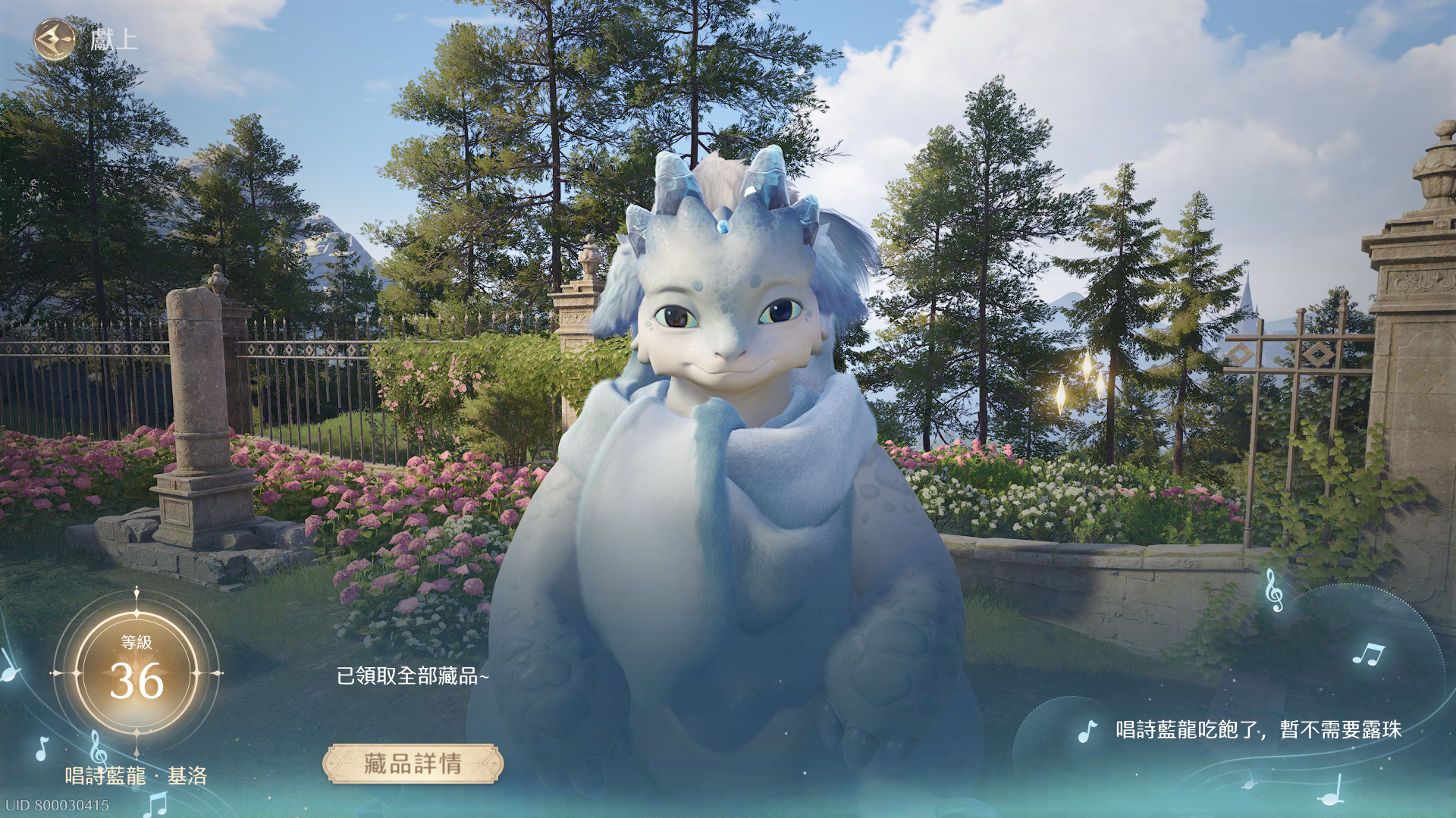 目前到所有內容已通關(包括活動)、地圖進度全100%(包含寶箱)、搭配師課題滿級,奇蹟大陸寶箱全收集、藍龍收集36等級(靈感露珠全收集)、奇想星全收集、花焰群島的奇想氣球全收集、焰光結晶全收集、主線進度全通關、活動、支線全通關、四大天王全完美通關、奇蹟之旅、1.4版本無限之心全開(目前進度如圖片、心得皆25000以上),香氣全蒐集、種多素材、兩套奇蹟套裝全收集,包含進化素材也已收集。