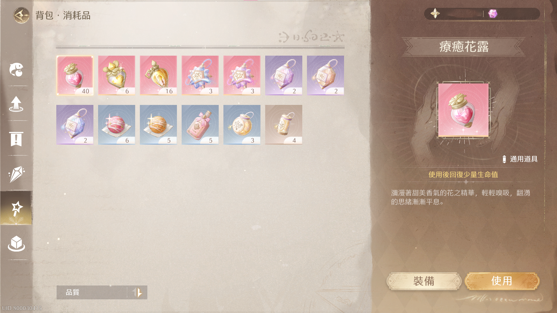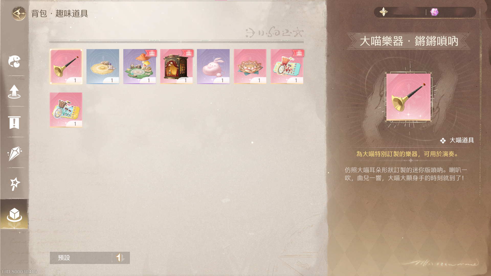 特殊物品 : 大喵樂器、蕾絲雲墊、悠野軟墊、夢祈華燈、無限暢行卡...等。