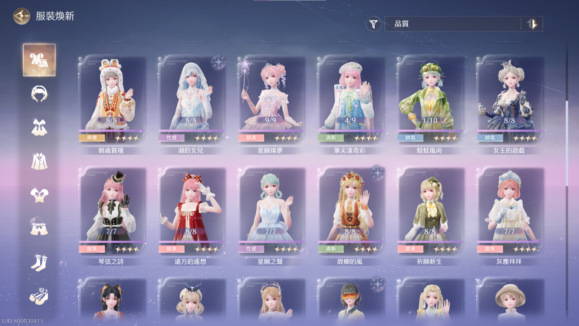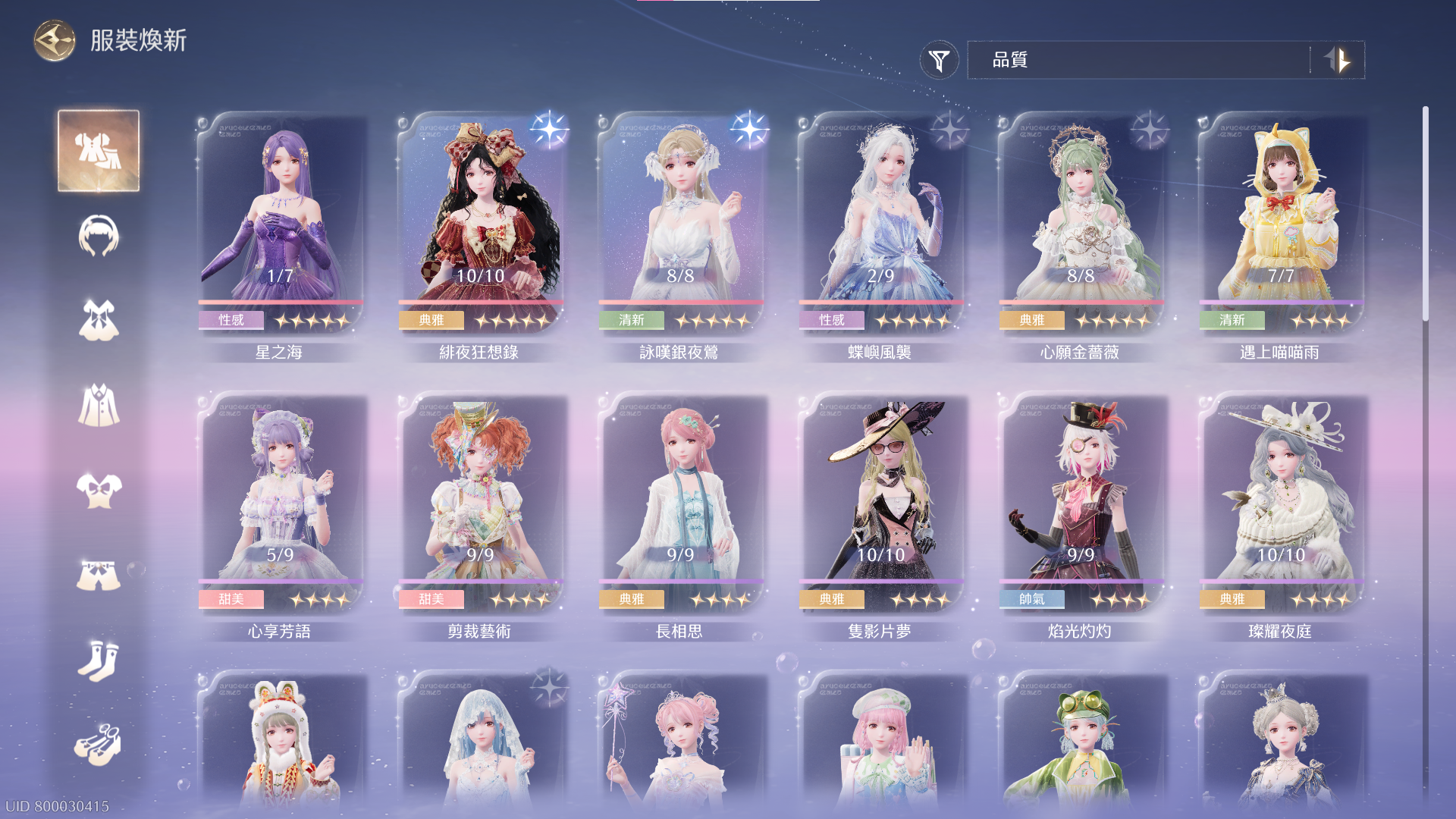 套裝 : 緋夜狂想錄、裁剪藝術、女王遊戲、遇上喵喵雨、新歲瞳瞳、朝歲賀禧、粉茸兔兔、湖的女兒、星願之聲...等。