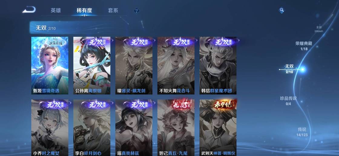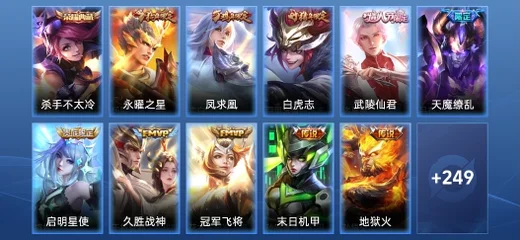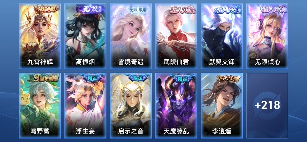 楊戩-埃及法老,嬴政-暗夜貴公子,李元芳-逐浪之夏,諸葛亮-掌控之力,孫臏-天使之翼,魯班七號-電玩小子,弈星-踏雪尋梅,諸葛亮-黃金分割率,李白-敏銳之力,劉備-潮玩造夢師,桑啟-畫中遊,蒙恬-蔚藍守將,甄姬-冰雪圓舞曲,鎧-曙光守護者,暃-碧珀緋影,盾山-圓桌騎士,魯班七號-木偶奇遇記,墨子-金屬風暴,亞連-破局者,韓信-街頭霸王,海月-王牌新星,張良-古海尋蹤,劉備-萬事如意,萊西奧-西部遊俠,牛魔-西部大鏢客,甄姬-花好人間,蒙犽-歸虛夢演,海月-幻泉霧影,呂布-聖誕狂歡,鬼谷子-阿摩司公爵,劉禪-天才門將,大喬-守護之力,孫尚香-水果甜心,花木蘭-兔女郎,白起-星夜王子,宮本武藏-鬼劍武藏,司空震-啟蟄,瀾-賞金獵手,曹操-幽靈船長,關羽-龍騰萬里,哪吒-次元突破,孫尚香-沉穩之力,小喬-丁香結,趙雲-白執事,楊玉環-霓裳曲,瑤-森,蘇烈-愛與和平,金蟬-前塵,司馬懿-暗淵魔法,東皇太一-東海龍王,妲己-紫羅蘭之誓,蔡文姬-薔薇王座,盤古-創世神祝,典韋-鐵甲之心,女媧-尼羅河女神,姜子牙-熾熱元素使,周瑜-海軍大將,李元芳-特種部隊,蒙恬-秩序獵龍將,魯班大師-乓乓大師,瀾-孤獵,沈夢溪-鯊炮海盜貓,百里守約-絕影神槍,不知火舞-魅語,孫策-海之征途,雲纓-赤焰之纓,哪吒-三太子,趙雲-忍·炎影,李信-灼熱之刃,宮本武藏-永珍初新,宮本武藏-未來紀元,王昭君-偶像歌手,楊戩-次元傲視,公孫離-無限星賞官,曜-歸虛夢演,百里守約-特工魅影,典韋-黃金武士,橘右京-修羅,小喬-萬聖前夜,張良-一千零一夜,裴擒虎-街頭旋風,趙雲-未來紀元,娜可露露-晚螢,沈夢溪-棒球奇才,鏡-冰刃幻境,夢奇-美夢成真,雲中君-荷魯斯之眼,馬超-倖存者,達摩-拳王,李白-千年之狐,張飛-五福同心,貂蟬-聖誕戀歌,上官婉兒-修竹墨客,狄仁傑-鷹眼統帥,司馬懿-魘語軍師,李白-範海辛,蘭陵王-暗隱獵獸者,元歌-午夜歌劇院,鬼谷子-幻樂之宴,老夫子-功夫老勺,鎧-龍域領主,貂蟬-異域舞娘,干將莫邪-第七人偶,墨子-進擊墨子號,花木蘭-水晶獵龍者,鍾馗-地府判官,扁鵲-化身博士,虞姬-加勒比小姐,黃忠-芝加哥教父,露娜-紫霞仙子,馬可波羅-激情綠茵,諸葛亮-星航指揮官,韓信-教廷特使,劉邦-聖殿之光,安琪拉-玩偶對對碰,阿軻-致命風華,雅典娜-戰爭女神,劉備-紐約教父,妲己-魅力維加斯,妲己-少女阿狸,亞瑟-死亡騎士,鍾無豔-海灘麗影,曹操-超能戰警
