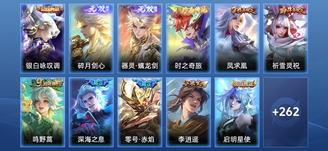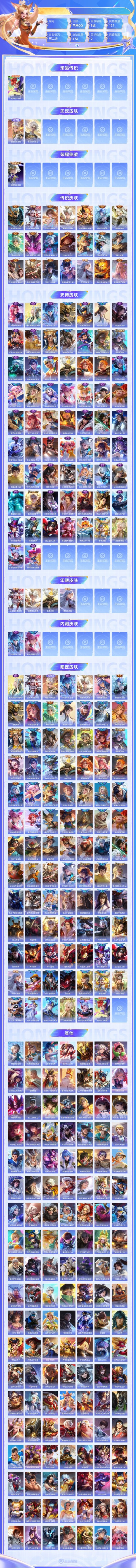 公孫離-祈雪靈祝,戈婭-玫藍誓約,明世隱-景韶洛都,阿軻-節奏熱浪,公孫離-花間舞,伽羅-花見巫女,趙懷真-器靈·浮夢爐,楊戩-埃及法老,孫策-末日機甲,雲纓-幻光神槍,曜-器靈·螭龍劍,弈星-萬物之道,少司緣-靈卦秘語,達摩-爆裂喵拳,瀾-願照·九州拓,安琪拉-玩偶對對碰,嫦娥-暖冬·兔眠,金蟬-前塵,虞姬-啟明星使,裴擒虎-祥瑞亨通,東皇太一-金福滿堂,姜子牙-星夢巡禮,鏡-熾陽神光,馬超-神威,雲中君-荷魯斯之眼,西施-雪境奇遇,蒼-維京掠奪者,桑啟-鳴野蒿,呂布-末日機甲,莊周-高山流水,白起-星夜王子,盤古-敬我三分,花木蘭-水晶獵龍者,鍾馗-地府判官,諸葛亮-黃金分割率,狄仁傑-錦衣衛,李元芳-妄想特派,姜子牙-天穹之誓,嫦娥-露花倒影,百里守約-絕影神槍,裴擒虎-街頭旋風,周瑜-熔金海岸,鍾無豔-生化警戒,米萊狄-精準探案法,大司命-暗都幽影,蒙恬-榮光聖徽,程咬金-群星魔術團,劉備-潮玩造夢師,后羿-完美運算,典韋-藍色畫面警告,莊周-鯉魚之夢,盤古-經緯探尋者,劉邦-劍破天穹,阿軻-愛心護理,宮本武藏-地獄之眼,弈星-踏雪尋梅,魯班七號-電玩小子,劉禪-喚靈魔甲,魯班七號-蔬鄉物語,扁鵲-無盡旅途,李元芳-蔬鄉物語,鍾無豔-春野之旅,沈夢溪-龍舞盛年,暃-星界遊俠,蘭陵王-暗隱獵獸者,露娜-瓷語鑑心,妲己-靈卜魔法,高漸離-燃音魔法,姜子牙-熾熱元素使,趙雲-忍·炎影,夏侯惇-乘風破浪,廉頗-功夫炙烤,馬可波羅-深海之息,李白-碎月劍心,鬼谷子-天穹祈燈,典韋-岱宗,蒙犽-百解令,司空震-地獄燃心,艾琳-流音漫舞,曹操-決勝大滿貫,亞瑟-心靈戰警,劉備-時之戀人,孫臏-天使之翼,蘇烈-愛與和平,阿古朵-江河有靈,魯班七號-時之奇旅,鍾無豔-聚星閃耀,張良-古海尋蹤,亞連-破局者,程咬金-無雙福將,雅典娜-黎明之約,豬八戒-潮玩探月行,雅典娜-冰冠公主,甄姬-花好人間,老夫子-潮流仙人,孫尚香-沉穩之力,魯班大師-探海日誌,姬小滿-零食大作戰,裴擒虎-擒濤扼浪,馬超-無雙飛將,孫尚香-薔薇戀人,桑啟-海鹽詩旅,李元芳-特種部隊,孫尚香-水果甜心,李元芳-雲中旅人,沈夢溪-大漠名商,蘭陵王-金庭之子,達摩-沙漠行僧,嬴政-搖滾巨星,馬可波羅-潮玩牛仔,李白-敏銳之力,狂鐵-特工戰影,豬八戒-豬悟能,墨子-金屬風暴,王昭君-精靈公主,蘇烈-千軍破陣,典韋-鐵甲之心,妲己-女僕咖啡,黃忠-芝加哥教父,司馬懿-魘語軍師,盾山-圓桌騎士,姜子牙-時尚教父,蒙恬-秩序獵龍將,魯班大師-乓乓大師,鍾馗-驅儺正儀,雲纓-赤焰之纓,曜-李逍遙,盤古-創世神祝,米萊狄-胡桃異想國,盤古-重灌意志,張良-繽紛繪卷,莊周-奇妙博物學,廉頗-地獄巖魂,程咬金-演武奪籌,達摩-星際陸戰隊,呂布-聖誕狂歡,沈夢溪-鯊炮海盜貓,上官婉兒-修竹墨客,元歌-雲間偶戲,劉禪-秘密基地,小喬-丁香結,李白-千年之狐,楊戩-次元傲視,大喬-守護之力,干將莫邪-久勝戰神,百里守約-特工魅影,狄仁傑-萬華元夜,孫尚香-時之戀人,亞瑟-潮玩騎士王,司空震-啟蟄,諸葛亮-星航指揮官,孫悟空-零號·赤焰,程咬金-功夫廚神,李信-一念神魔,瀾-孤獵,小喬-繽紛獨角獸,雲中君-纖雲弄巧,蒙犽-狂想玩偶喵,甄姬-冰雪圓舞曲,哪吒-三太子,裴擒虎-李小龍,劉備-萬事如意,李元芳-逐浪之夏,雅典娜-單詞大作戰,鬼谷子-原初探秘者,橘右京-修羅,鍾無豔-王者之錘,蔡文姬-繁星吟遊,典韋-黃金武士,老夫子-醍醐杖,李信-灼熱之刃,趙雲-未來紀元,明世隱-疑決卦,鏡-冰刃幻境,沈夢溪-棒球奇才,狄仁傑-鷹眼統帥,達摩-大發明家,馬超-倖存者,蘇烈-堅韌之力,哪吒-次元突破,曜-歸虛夢演,弈星-混沌棋,露娜-哥特玫瑰,夏侯惇-朔風刀,項羽-帝國元帥,狂鐵-命運角鬥場,孫臏-歸虛夢演,張飛-五福同心,雅典娜-戰爭女神,曹操-幽靈船長,盾山-御鑾,鎧-龍域領主,宮本武藏-永珍初新,呂布-野性能量,牛魔-御旌,明世隱-虹雲星官,嬴政-白晝王子,白起-白色死神,劉邦-德古拉伯爵,關羽-龍騰萬里,孫悟空-大聖娶親,諸葛亮-掌控之力,豬八戒-年年有餘,呂布-獵獸之王,元歌-午夜歌劇院,宮本武藏-鬼劍武藏,米萊狄-御霄,貂蟬-仲夏夜之夢,項羽-科學大爆炸,馬可波羅-激情綠茵,楊玉環-遇見飛天,狂鐵-御獅,安琪拉-如懿,蘭陵王-隱刃,達摩-拳王,百里玄策-威尼斯狂歡,鎧-曙光守護者,鬼谷子-幻樂之宴,扁鵲-化身博士,宮本武藏-霸王丸,典韋-窮奇,貂蟬-異域舞娘,羋月-重明,老夫子-功夫老勺,牛魔-制霸全明星,李白-鳳求凰,李白-範海辛,曹操-燭龍,太乙真人-饕餮,孫尚香-火炮千金,狄仁傑-魔術師,小喬-萬聖前夜,韓信-白龍吟,趙雲-皇家上將,孫悟空-地獄火,魯班七號-福祿兄弟,韓信-街頭霸王,鍾無豔-海灘麗影,花木蘭-兔女郎,項羽-海灘派對,狄仁傑-陰陽師,韓信-教廷特使,白起-猙,王昭君-乞巧織情,劉邦-聖殿之光,虞姬-凱爾特女王,趙雲-白執事,妲己-少女阿狸,妲己-魅力維加斯,亞瑟-死亡騎士,蔡文姬-舞動綠茵,鎧-銀白詠嘆調,張良-一千零一夜,孫策-時之奇旅,百里守約-百相守夢,阿古朵-熊喵少女,劉禪-天才門將,孫策-海之征途,孫臏-茶境仙,夢奇-頑趣,萊西奧-西部遊俠,孫悟空-西部大鏢客,影-魅影綺裳,夏侯惇-戰爭騎士,趙懷真-太極少年,牛魔-西部大鏢客,典韋-鐵骨偃魂,馬超-訪茗客,盾山-極冰防禦線,太乙真人-謐流熔爐,老夫子-百相守夢,東皇太一-噬滅天穹,蒼-蒼林狼騎