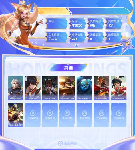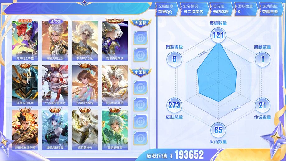珍品傳說1 無雙2 典藏1 傳說21 史詩65 限定90 英雄121 造型273 貴族8級 造型價值:193652 【珍品傳說1】 孫策時之奇旅 【無雙造型2】 曜器靈螭龍劍 李白碎月劍心 【榮耀典藏1】 鎧銀白詠嘆調 【傳說造型21】 孫策末日機甲 公孫離祈雪靈祝 雲纓幻光神槍 瀾願照九州拓 裴擒虎祥瑞亨通 虞姬啟明星使 鏡熾陽神光 桑啟鳴野蒿 宮本武藏地獄之眼 馬可波羅深海之息 劉備時之戀人