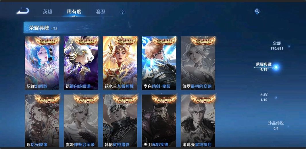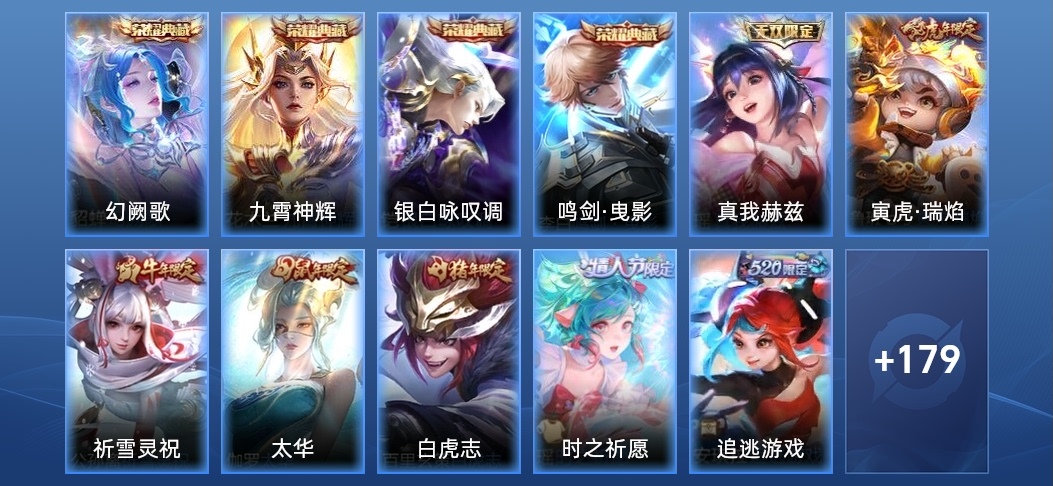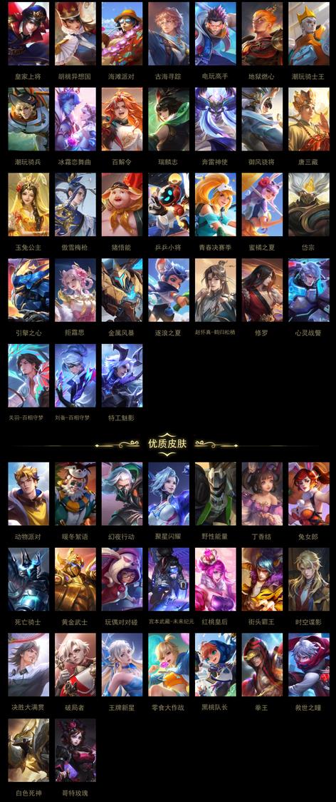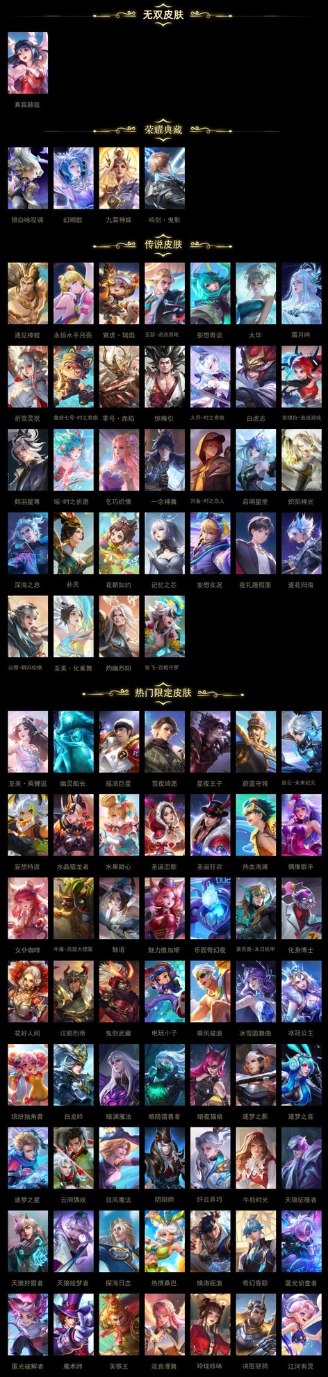 女媧-補天,李白-謫仙醉月,亞瑟-動物派對,李信-灼熱之刃,魯班七號-黑桃隊長,關羽-決勝驍騎,瑤-時之祈願,海諾-時空諜影,瀾-逐花歸海,韓信-白龍吟,牛魔-奔雷神使,公孫離-玉兔公主,雲中君-纖雲弄巧,蒙恬-蔚藍守將,周瑜-雪夜綺願,后羿-完美運算,程咬金-暖冬絮語,嫦娥-拒霜思,露娜-霜月吟,典韋-岱宗,百里守約-特工魅影,蒙犽-百解令,花木蘭-瑞麟志,百里玄策-白虎志,狄仁傑-夜禮服假面,王昭君-永恆水手月亮,米萊狄-胡桃異想國,李白-鳴劍·曳影,呂布-聖誕狂歡,曹操-決勝大滿貫,宮本武藏-驚梅引,小喬-萬聖前夜,鎧-龍域領主,蘭陵王-幻夜行動,韓信-傲雪梅槍,公孫離-祈雪靈祝,馬可波羅-深海之息,魯班七號-寅虎·瑞焰,西施-至美·乘鯉謠,甄姬-至美·化雀舞,阿古朵-江河有靈,上官婉兒-天狼繪夢者,魯班七號-時之奇旅,大喬-時之奇旅,妲己-女僕咖啡,蘭陵王-影龍天霄,貂蟬-聖誕戀歌,鍾無豔-聚星閃耀,甄姬-花好人間,韓信-逐夢之影,曹操-超能戰警,艾琳-流音漫舞,司空震-地獄燃心,亞連-破局者,孫悟空-零號·赤焰,瀾-孤獵,李元芳-逐浪之夏,妲己-熱情桑巴,花木蘭-青春決賽季,張良-古海尋蹤,海月-王牌新星,魯班七號-乒乒小將,貂蟬-逐夢之音,呂布-遇見神鼓,狄仁傑-鷹眼統帥,李元芳-匿光偵查者,黃忠-芝加哥教父,馬可波羅-激情綠茵,曹操-幽靈船長,扁鵲-化身博士,韓信-街頭霸王,萊西奧-末日機甲,蔡文姬-花朝如約,司馬懿-暗淵魔法,鍾馗-樂園奇幻夜,李信-一念神魔,狄仁傑-陰陽師,鏡-熾陽神光,明世隱-占星師,裴擒虎-街頭旋風,公孫離-花間舞,雲纓-鶴歸松棲,司空震-啟蟄,哪吒-熱血海灘,公孫離-蜜橘之夏,趙雲-未來紀元,亞瑟-死亡騎士,妲己-魅力維加斯,宮本武藏-鬼劍武藏,趙懷真-鶴歸松棲,曹操-天狼征服者,小喬-繽紛獨角獸,亞瑟-潮玩騎士王,王昭君-午後時光,元歌-雲間偶戲,狂鐵-電玩高手,雅典娜-冰冠公主,馬可波羅-逐夢之星,孫尚香-水果甜心,伽羅-太華,蘭陵王-隱刃,安琪拉-玩偶對對碰,露娜-哥特玫瑰,孫臏-未來旅行,花木蘭-兔女郎,鏡-冰刃幻境,花木蘭-水晶獵龍者,呂布-野性能量,嬴政-搖滾巨星,瑤-真我赫茲,蒙恬-秩序獵龍將,宮本武藏-未來紀元,劉邦-聖殿之光,曜-歸虛夢演,魯班七號-木偶奇遇記,楊戩-埃及法老,狄仁傑-錦衣衛,干將莫邪-冰霜戀舞曲,嫦娥-露花倒影,瑤-森,大喬-伊勢巫女,東皇太一-東海龍王,孫悟空-西部大鏢客,諸葛亮-星航指揮官,夢奇-美夢成真,白起-白色死神,甄姬-冰雪圓舞曲,蒼-維京掠奪者,貂蟬-異域舞娘,劉備-漢昭烈帝,羋月-紅桃皇后,亞瑟-心靈戰警,牛魔-西部大鏢客,鬼谷子-阿摩司公爵,裴擒虎-天狼狩獵者,貂蟬-幻闕歌,蒙犽-歸虛夢演,露娜-緋紅之刃,沈夢溪-棒球奇才,后羿-精靈王,狂鐵-命運角鬥場,李元芳-妄想特派,呂布-御風驍將,上官婉兒-妄想奇談,馬可波羅-妄想實況,夏侯惇-乘風破浪,虞姬-啟明星使,不知火舞-魅語,王昭君-乞巧織情,劉備-時之戀人,橘右京-修羅,東皇太一-灼幽烈陽,魯班七號-電玩小子,鎧-銀白詠嘆調,達摩-拳王,孫悟空-美猴王,趙雲-引擎之心,阿軻-暗夜貓娘,墨子-金屬風暴,戈婭-馭風魔法,西施-玲瓏珍味,姬小滿-零食大作戰,花木蘭-九霄神輝,小喬-丁香結,魯班大師-探海日誌,白起-星夜王子,蘭陵王-暗隱獵獸者,王昭君-偶像歌手,扁鵲-奇幻香蹤,典韋-黃金武士,楊戩-潮玩騎兵,豬八戒-豬悟能,金蟬-唐三藏,司馬懿-魘語軍師,干將莫邪-第七人偶,馬超-倖存者,高漸離-金屬狂潮,扁鵲-救世之瞳,裴擒虎-擒濤扼浪,狄仁傑-魔術師,公孫離-記憶之芯,項羽-海灘派對,趙雲-皇家上將,張飛-百相守夢,亞瑟-追逃遊戲,關羽-百相守夢,安琪拉-追逃遊戲,劉備-百相守夢,沈夢溪-匿光破解者,諸葛亮-鶴羽星尊