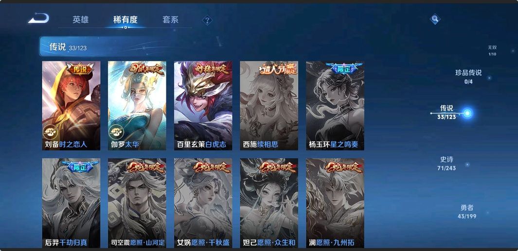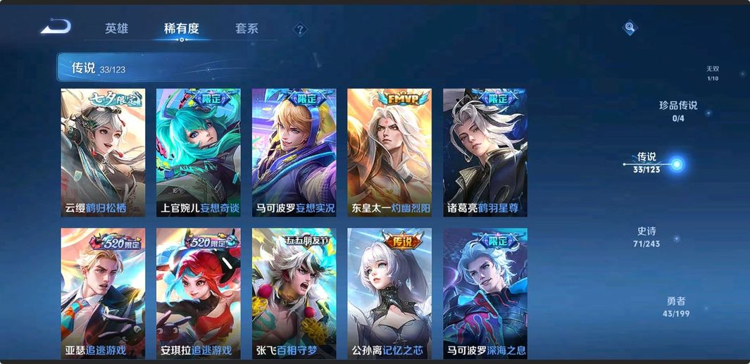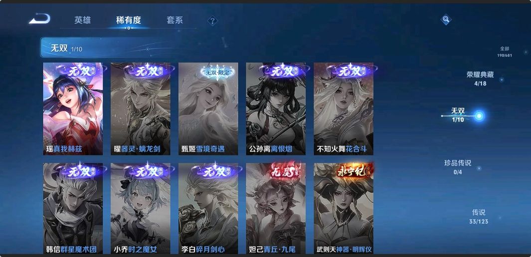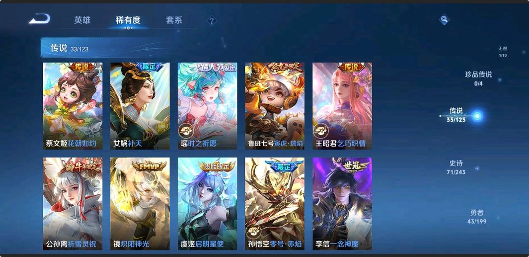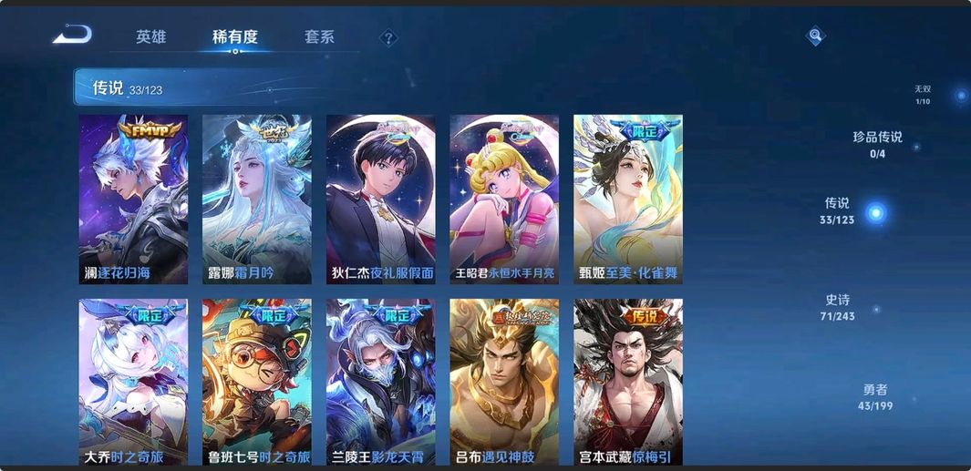 關羽-決勝驍騎,牛魔-奔雷神使,公孫離-玉兔公主,雲中君-纖雲弄巧,周瑜-雪夜綺願,嫦娥-拒霜思,典韋-岱宗,蒙犽-百解令,花木蘭-瑞麟志,米萊狄-胡桃異想國,韓信-傲雪梅槍,西施-至美·乘鯉謠,阿古朵-江河有靈,上官婉兒-天狼繪夢者,韓信-逐夢之影,司空震-地獄燃心,妲己-熱情桑巴,花木蘭-青春決賽季,魯班七號-乒乒小將,貂蟬-逐夢之音,李元芳-匿光偵查者,公孫離-蜜橘之夏,趙懷真-鶴歸松棲,曹操-天狼征服者,元歌-雲間偶戲,狂鐵-電玩高手,馬可波羅-逐夢之星,干將莫邪-冰霜戀舞曲,裴擒虎-天狼狩獵者,呂布-御風驍將,趙雲-引擎之心,戈婭-馭風魔法,扁鵲-奇幻香蹤,豬八戒-豬悟能,金蟬-唐三藏,狄仁傑-魔術師,趙雲-皇家上將,關羽-百相守夢,劉備-百相守夢,沈夢溪-匿光破解者