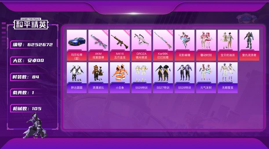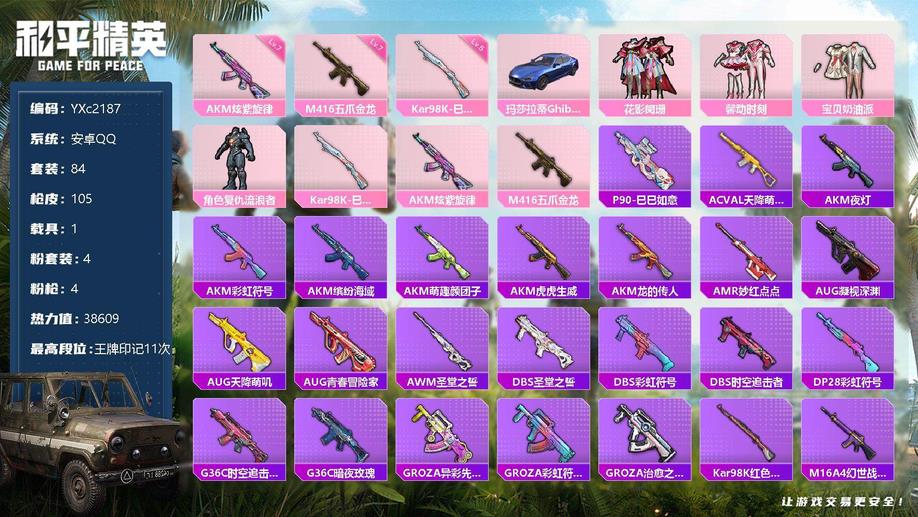 283-[]〖保證金商家·終身售後·找回賠〗-c2187-〖不可二次〗〖滿級五爪金龍 滿級炫紫旋律 胖達 素材號〗〖因賽季更新遊戲段付以上號為準!〗 安卓-熱力值 11王牌印記 歷史超級王牌15星 84套裝 105槍皮 〖1載具〗 瑪莎拉蒂藍色 〖1稀有〗 AKM-繽紛海域 〖4粉裝〗 寶貝奶油派 馨動時刻 花影闌珊 復仇流浪者 〖4特效槍〗 M416-五爪金龍 (7級) AKM-炫紫旋律 (