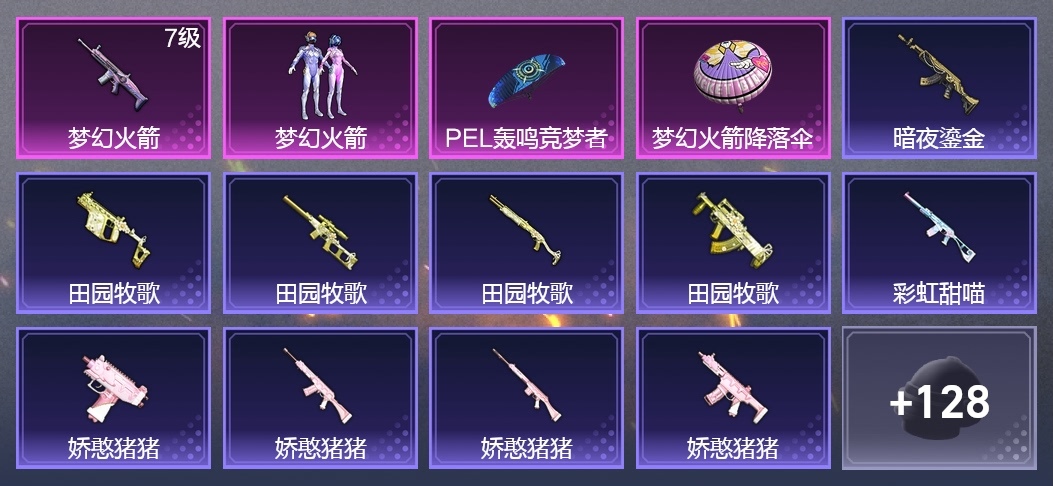 SCAR-L-夢幻火箭,AKM-彩虹符號,AKM-霓虹街區,AKM-奇異狩獵者,M16A4-九霄,M16A4-甜心亞夢,M16A4-幻世戰舞者,SCAR-L-玉兔迎春,M416-倉鼠灰灰,M416-夜燈,GROZA-黑色刀鋒,GROZA-田園牧歌,AUG-耀粉歌者,QBZ-彩虹符號,M762-拳皇97,M762-暗夜鎏金,Mk47-烏木金紋,AC-VAL-彩虹甜喵,AC-VAL-天降萌嘰,AC-VAL-甜心亞夢,蜜獾-天降萌嘰,蜜獾-嬌憨豬豬,Kar98K-紅色方程式,Kar98K-勇闖險境,M24-眾神之王,SKS-勇闖險境,VSS-田園牧歌,VSS-黑色刀鋒,Mini14-金鼠迎春,Mk14-烏木金紋,SLR-嬌憨豬豬,SLR-眾神之王,UZI-嬌憨豬豬,UZI-眾神之王,UMP45-春暖花開,Vector-田園牧歌,Vector-黑色刀鋒,湯姆遜-勇闖險境,MP5K-眾神之王,S686-生命誓言,S1897-炫彩節奏,S1897-勇闖險境,S12K-嬌憨豬豬,S12K-幻世戰舞者,S12K-華貴君王,DBS-甜心亞夢,SPAS-12-田園牧歌,M249-拳皇97,DP-28-甜心亞夢,DP-28-潮萌小黃鴨,MG3-幻世戰舞者,MG3-烏木金紋,P92-拳皇97,撬棍-快樂主宰,撬棍-幻世戰舞者,撬棍-傳奇偵探,平底鍋-繽紛糖果,平底鍋-炫紫旋律,平底鍋-眾神之王,平底鍋-黑色刀鋒,平底鍋-田園牧歌,平底鍋-拳皇97,平底鍋-勇闖險境,平底鍋-嬌憨豬豬,平底鍋-甜心亞夢,破片手榴彈-潮萌小黃鴨