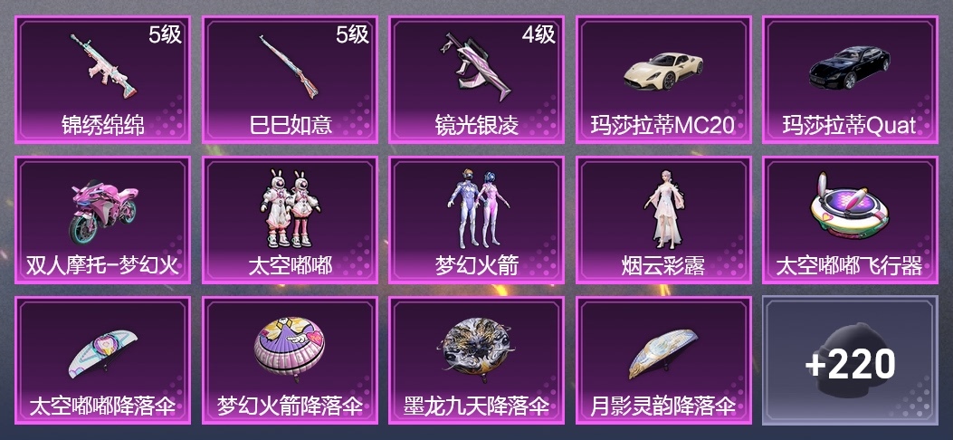 SCAR-L-錦繡綿綿,GROZA-鏡光銀凌,Kar98K-巳巳如意,AKM-龍的傳人,AKM-破曉戰魂,M16A4-冰河戰士,SCAR-L-海鹽豹豹,SCAR-L-玉兔迎春,M416-紅色方程式,M416-緋紅前夜,M416-糯團青竹,GROZA-懵萌河馬,GROZA-田園牧歌,AUG-耀粉歌者,AUG-天降萌嘰,QBZ-純真浪花,M762-天降萌嘰,M762-彩虹符號,M762-緋紅前夜,M762-雛菊兔兔,Mk47-烏木金紋,Mk47-妙紅點點,G36C-懵萌河馬,AC-VAL-烏木金紋,AC-VAL-天降萌嘰,AC-VAL-快閃甜心,蜜獾-天降萌嘰,蜜獾-嬌憨豬豬,蜜獾-糖糖葫蘆,蜜獾-垂柳戲鴨,Kar98K-彩虹符號,Kar98K-洛神天依,Kar98K-夢幻火箭,M24-冰封烈焰,AWM-炙焰牛王,AWM-焰鷹斗篷,AWM-純真浪花,AWM-颯粉甜心,莫辛納甘-懵萌河馬,莫辛納甘-烏木金紋,AMR-妙紅點點,M200-驚鴻俠骨,SKS-未來歌姬,SKS-糯團青竹,VSS-田園牧歌,Mini14-香桃花海,Mini14-塗山之戀,Mini14-夢幻火箭,Mini14-耀粉歌者,Mini14-雛菊兔兔,Mk14-冰河戰士,Mk14-烏木金紋,SLR-嬌憨豬豬,SLR-彩虹符號,QBU-颯粉甜心,M417-驚鴻俠骨,MK20-H-糖糖葫蘆,MK20-H-快閃甜心,UZI-紅色方程式,UZI-嬌憨豬豬,UZI-啾咪啾咪,UZI-月影靈韻,UMP45-糖糖葫蘆,UMP45-生命誓言,UMP45-塗山之戀,Vector-焰鷹斗篷,Vector-燕燕於飛,Vector-田園牧歌,湯姆遜-天降萌嘰,湯姆遜-純真浪花,湯姆遜-耀粉歌者,野牛-燕燕於飛,野牛-雛菊兔兔,MP5K-颯粉甜心,P90-快閃甜心,P90-巳巳如意,S686-巳巳如意,S1897-炫彩節奏,S12K-垂柳戲鴨,S12K-玩趣呆呆,S12K-嬌憨豬豬,DBS-焰鷹斗篷,AA12-G-純真浪花,SPAS-12-田園牧歌,SPAS-12-太空嘟嘟,SPAS-12-燕燕於飛,M249-彩虹符號,M249-妙紅點點,M249-破曉戰魂,DP-28-焰鷹斗篷,MG3-幻世戰舞者,MG3-烏木金紋,MG3-妙紅點點,MG3-驚鴻俠骨,PKM-懵萌河馬,R1895-雛菊兔兔,P18C-糖糖葫蘆,蠍式手槍-千金淑貓,蠍式手槍-閒夢青纓,蠍式手槍-燕燕於飛,沙漠之鷹-快閃甜心,TMP-9-幽焰騎士,大砍刀-盛世驚鴻,撬棍-緋紅前夜,平底鍋-空島之星,平底鍋-快閃甜心,平底鍋-光之冒險,平底鍋-純真浪花,平底鍋-驚鴻俠骨,平底鍋-嬌憨豬豬,平底鍋-懵萌河馬,平底鍋-焰鷹斗篷,平底鍋-田園牧歌,平底鍋-妙紅點點,平底鍋-雛菊兔兔,平底鍋-糖糖葫蘆,十字弩-燕燕於飛,爆炸獵弓-驚鴻俠骨,破片手榴彈-巳巳如意,破片手榴彈-太空嘟嘟,破片手榴彈-呆爆全場