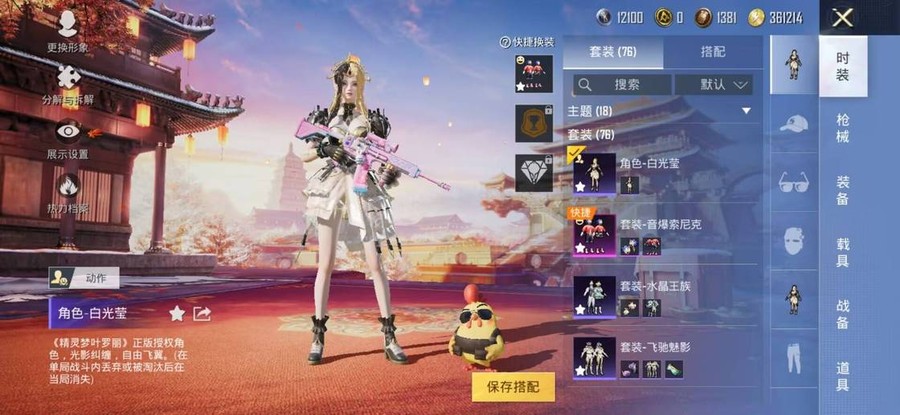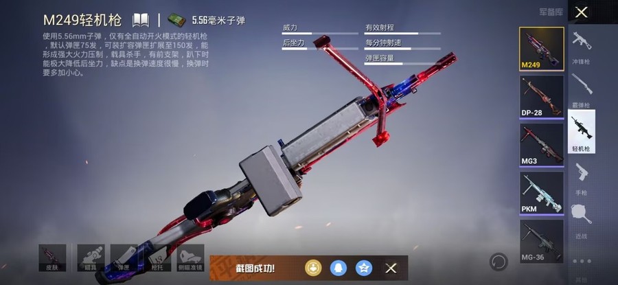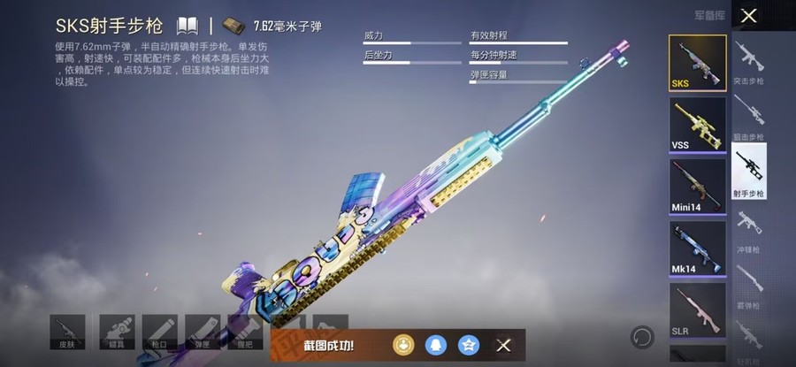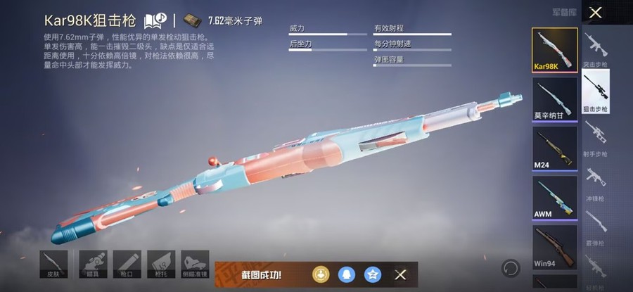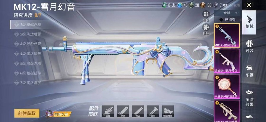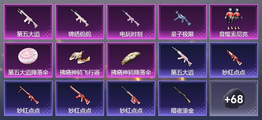 SCAR-L-錦繡綿綿,M416-電玩時刻,UMP45-量子極限,Vector-創世·救贖,M417-第五大道,AKM-恐龍拽拽,AKM-江南煙雨,AKM-築夢精靈,GROZA-懵萌河馬,GROZA-田園牧歌,AUG-耀粉歌者,QBZ-飛馳魅影,M762-第五大道,Mk47-妙紅點點,G36C-懵萌河馬,蜜獾-垂柳戲鴨,蜜獾-嬌憨豬豬,UZI-嬌憨豬豬,Vector-焰鷹斗篷,Vector-田園牧歌,湯姆遜-耀粉歌者,P90-飛馳魅影,Kar98K-飛馳魅影,AWM-焰鷹斗篷,VSS-田園牧歌,Mini14-穿刺龍蝦,SLR-嬌憨豬豬,莫辛納甘-懵萌河馬,AMR-妙紅點點,M417-驚鴻俠骨,M200-驚鴻俠骨,S1897-暗夜鎏金,S1897-飛馳魅影,S12K-垂柳戲鴨,S12K-嬌憨豬豬,DBS-焰鷹斗篷,SPAS-12-田園牧歌,M249-妙紅點點,M249-星之彼岸,DP-28-焰鷹斗篷,DP-28-甜蜜旋律,MG3-妙紅點點,MG3-驚鴻俠骨,PKM-懵萌河馬
