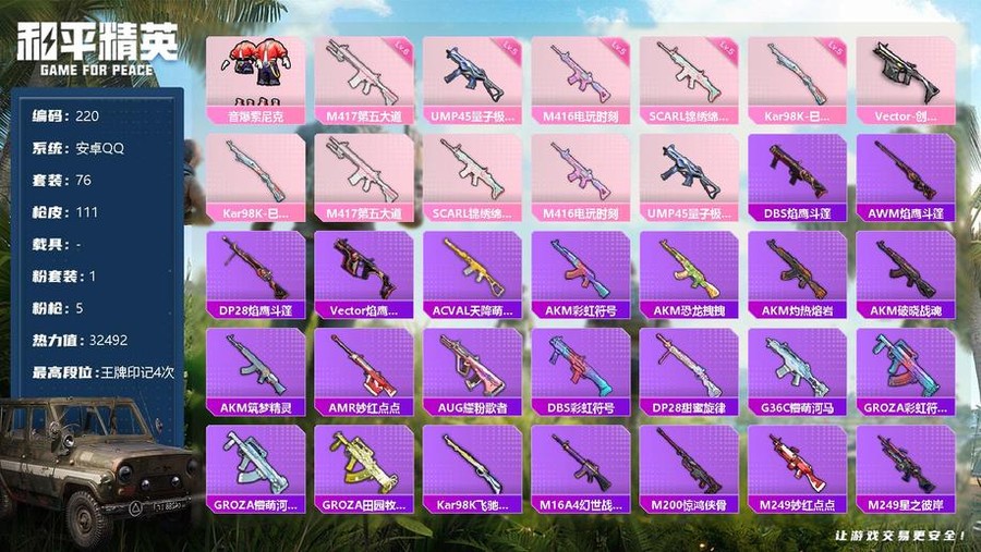 220-【商品標題】:安卓 手Q-1粉裝-5特效槍-0載具-32492熱力值-4印記-76套裝-111槍皮