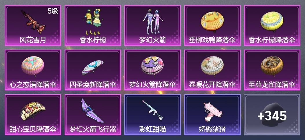 M416-風花雪月,AKM-夜燈,AKM-破曉戰魂,AKM-龍的傳人,AKM-彩虹符號,AKM-灼熱熔岩,AKM-霓虹街區,AKM-冰涼西瓜,AKM-萌趣顏糰子,AKM-生命誓言,AKM-虎虎生威,M16A4-幻世戰舞者,M16A4-紅色方程式,M16A4-機械英豪,M16A4-藍色火焰,SCAR-L-甜蜜誓約,SCAR-L-玉兔迎春,SCAR-L-紅色方程式,SCAR-L-炫彩節奏,SCAR-L-生命誓言,M416-緋紅前夜,M416-倉鼠灰灰,M416-夜燈,M416-藍色火焰,M416-糯團青竹,M416-紅色方程式,GROZA-彩虹符號,GROZA-黑色刀鋒,GROZA-治癒之星,GROZA-異彩先驅,GROZA-暗夜武裝,GROZA-生命誓言,AUG-耀粉歌者,AUG-青春冒險家,AUG-魔法學院,AUG-天降萌嘰,QBZ-飛馳魅影,M762-生命誓言,M762-牛氣沖天,M762-緋紅前夜,M762-瑞龍福將,M762-快樂主宰,M762-拳皇97,Mk47-青春冒險家,Mk47-烏木金紋,G36C-暗夜玫瑰,AC-VAL-彩虹甜喵,AC-VAL-烏木金紋,AC-VAL-天降萌嘰,蜜獾-嬌憨豬豬,蜜獾-天降萌嘰,Kar98K-影襲,Kar98K-炫彩節奏,Kar98K-彩虹符號,Kar98K-王子的夏天,Kar98K-夢幻火箭,Kar98K-飛馳魅影,Kar98K-紅色方程式,M24-治癒之星,M24-炫彩節奏,M24-眾神之王,M24-冰封烈焰,M24-奇異狩獵者,Win94-瑞龍福將,Win94-機械英豪,莫辛納甘-烏木金紋,SKS-玉龍,SKS-夜燈,SKS-炫彩節奏,VSS-星之彼岸,VSS-彩虹符號,VSS-繁花小夜曲,VSS-黑色刀鋒,Mini14-炫彩節奏,Mini14-耀粉歌者,Mini14-春暖花開,Mini14-金鼠迎春,Mini14-異彩先驅,Mini14-生命誓言,Mini14-塗山之戀,Mk14-治癒之星,Mk14-相思殘雪,Mk14-烏木金紋,SLR-眾神之王,SLR-嬌憨豬豬,QBU-青春冒險家,UZI-生命誓言,UZI-眾神之王,UZI-炫彩節奏,UZI-嬌憨豬豬,UZI-紅色方程式,UMP45-夜燈,UMP45-春暖花開,UMP45-藍色火焰,UMP45-生命誓言,UMP45-塗山之戀,Vector-黑色刀鋒,Vector-香水檸檬,Vector-彩虹符號,Vector-金玉無雙,Vector-暗夜玫瑰,Vector-治癒之星,Vector-夜燈,Vector-生命誓言,湯姆遜-耀粉歌者,湯姆遜-異彩先驅,湯姆遜-炫彩節奏,湯姆遜-天降萌嘰,野牛-青春冒險家,野牛-機械英豪,野牛-王牌四分衛,MP5K-甜蜜誓約,MP5K-異彩先驅,MP5K-眾神之王,P90-飛馳魅影,S686-紅色方程式,S686-冰封烈焰,S686-生命誓言,S1897-飛馳魅影,S1897-春暖花開,S1897-炫彩節奏,S12K-嬌憨豬豬,S12K-幻世戰舞者,S12K-瑞龍福將,S12K-破曉戰魂,S12K-機械英豪,S12K-PEL轟鳴競夢者,DBS-彩虹符號,M249-破曉戰魂,M249-彩虹符號,M249-星之彼岸,M249-拳皇97,M249-糯團青竹,DP-28-彩虹符號,DP-28-清新檸檬,MG3-烏木金紋,MG3-瑞龍福將,P92-拳皇97,P1911-冰封烈焰,蠍式手槍-歡樂香蕉,撬棍-齊天大聖,撬棍-傳奇偵探,平底鍋-眾神之王,平底鍋-冰封烈焰,平底鍋-空投萌嘰,平底鍋-拳皇97,平底鍋-繽紛糖果,平底鍋-治癒之星,平底鍋-光之冒險,平底鍋-異彩先驅,平底鍋-嬌憨豬豬,平底鍋-火吻草莓,平底鍋-機械英豪,平底鍋-黑色刀鋒,平底鍋-瑞龍福將,平底鍋-飛馳魅影,平底鍋-五爪金龍,平底鍋-青春冒險家,破片手榴彈-萌趣顏糰子
