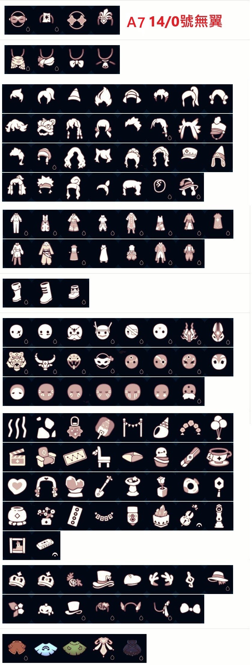| A6 | 130+光翼 1號.13號.14號身高 (14號需+200T) (下單前請先詢問此款有無現貨) 雙星季前先祖動作已收集+季節任務已完成+衣櫃物品110多件(如上方圖)+3000蠟燭 (包含背帶褲.寶寶褲.擊劍褲.黃鼠狼.櫻花髮型.萬聖貓貓頭.虛榮.大波浪.櫻花斗篷.紫藤斗篷.花苞斗篷.魔法鍋.星星燈等等..完整圖請看上面衣櫃圖) | 800T |