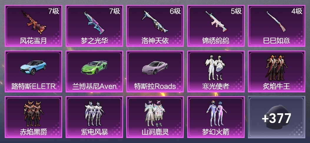 AKM-夢之光華,SCAR-L-錦繡綿綿,M416-風花雪月,Kar98K-巳巳如意,MG3-洛神天依,AKM-龍的傳人,AKM-虎虎生威,AKM-破曉戰魂,AKM-夜燈,AKM-萌趣顏糰子,AKM-生命誓言,AKM-灼熱熔岩,AKM-王牌投手,AKM-彩虹符號,M16A4-生命誓言,M16A4-夜燈,M16A4-幻世戰舞者,M16A4-冰河戰士,M16A4-甜心亞夢,SCAR-L-生命誓言,SCAR-L-黃金龍骨,SCAR-L-海鹽豹豹,SCAR-L-炫彩節奏,M416-彩虹嘻嘻猴,M416-紅色方程式,M416-藍色火焰,M416-糯團青竹,GROZA-異彩先驅,GROZA-恐龍拽拽,GROZA-生命誓言,GROZA-田園牧歌,GROZA-懵萌河馬,GROZA-彩虹符號,GROZA-治癒之星,GROZA-雷霆特警,AUG-天降萌嘰,AUG-耀粉歌者,AUG-閒夢青纓,AUG-青春冒險家,QBZ-未來歌姬,QBZ-洛神天依,QBZ-飛馳魅影,QBZ-彩虹符號,QBZ-原初聖火,M762-天降萌嘰,M762-深海曼妙,M762-牛氣沖天,M762-緋紅前夜,M762-瑞龍福將,M762-雛菊兔兔,M762-鐳射皇者,Mk47-青春冒險家,Mk47-妙紅點點,Mk47-洛神天依,Mk47-烏木金紋,G36C-炙焰牛王,G36C-懵萌河馬,G36C-時空追擊者,AC-VAL-烏木金紋,AC-VAL-快閃甜心,AC-VAL-天降萌嘰,AC-VAL-甜心亞夢,蜜獾-嬌憨豬豬,蜜獾-天降萌嘰,Kar98K-彩虹符號,Kar98K-歡樂麻醬,Kar98K-炫彩節奏,Kar98K-飛馳魅影,Kar98K-洛神天依,Kar98K-紅色方程式,M24-炫彩節奏,M24-治癒之星,AWM-炙焰牛王,AWM-焰鷹斗篷,Win94-瑞龍福將,莫辛納甘-炙焰牛王,莫辛納甘-烏木金紋,莫辛納甘-懵萌河馬,AMR-妙紅點點,M200-驚鴻俠骨,SKS-時空追擊者,VSS-田園牧歌,VSS-鐳射皇者,Mini14-生命誓言,Mini14-雛菊兔兔,Mini14-原初聖火,Mini14-異彩先驅,Mini14-林間仙鹿,Mini14-阿狸紅,Mini14-炫彩節奏,Mini14-塗山之戀,Mini14-輝耀戰甲,Mk14-相思殘雪,Mk14-冰河戰士,Mk14-治癒之星,Mk14-烏木金紋,SLR-嬌憨豬豬,QBU-青春冒險家,QBU-錦繡火鯉,M417-驚鴻俠骨,MK20-H-快閃甜心,MK20-H-星途旅人,UZI-冰河戰士,UZI-紅色方程式,UZI-天降萌嘰,UZI-啾咪啾咪,UZI-嬌憨豬豬,UZI-炫彩節奏,UMP45-塗山之戀,UMP45-生命誓言,UMP45-時空追擊者,UMP45-仲夏莫吉托,Vector-治癒之星,Vector-焰鷹斗篷,Vector-生命誓言,Vector-彩虹符號,Vector-田園牧歌,湯姆遜-幻影戰神,湯姆遜-奇異狩獵者,湯姆遜-異彩先驅,湯姆遜-天降萌嘰,湯姆遜-銀刃賽羅,野牛-雛菊兔兔,野牛-青春冒險家,野牛-夜燈,MP5K-異彩先驅,P90-飛馳魅影,P90-快閃甜心,P90-玩趣呆呆,S686-生命誓言,S686-紅色方程式,S1897-飛馳魅影,S1897-鐳射皇者,S1897-碧影閃光,S12K-幻世戰舞者,S12K-夜燈,S12K-玩趣呆呆,S12K-瑞龍福將,S12K-嬌憨豬豬,DBS-甜心亞夢,DBS-彩虹甜喵,DBS-時空追擊者,DBS-聖堂之誓,DBS-焰鷹斗篷,SPAS-12-田園牧歌,M249-妙紅點點,M249-星之彼岸,M249-彩虹符號,M249-四聖煥新,M249-冷魅冰騎,M249-鐳射皇者,DP-28-原初聖火,DP-28-甜心亞夢,DP-28-焰鷹斗篷,MG3-驚鴻俠骨,MG3-妙紅點點,MG3-幻世戰舞者,MG3-瑞龍福將,MG3-烏木金紋,PKM-懵萌河馬,PKM-啾咪啾咪,R1895-雛菊兔兔,P18C-原初聖火,蠍式手槍-閒夢青纓,蠍式手槍-歡樂香蕉,沙漠之鷹-快閃甜心,撬棍-齊天大聖,平底鍋-光之冒險,平底鍋-瑞龍福將,平底鍋-快閃甜心,平底鍋-雛菊兔兔,平底鍋-時空追擊者,平底鍋-焰鷹斗篷,平底鍋-原初聖火,平底鍋-田園牧歌,平底鍋-嬌憨豬豬,平底鍋-飛行日記,平底鍋-懵萌河馬,平底鍋-異彩先驅,平底鍋-青春冒險家,平底鍋-驚鴻俠骨,平底鍋-飛馳魅影,平底鍋-治癒之星,平底鍋-空島之星,平底鍋-鐳射皇者,平底鍋-甜心亞夢,平底鍋-妙紅點點,平底鍋-青春物語,爆炸獵弓-驚鴻俠骨,破片手榴彈-星途旅人,破片手榴彈-萌趣顏糰子,破片手榴彈-童話森林,破片手榴彈-胡桃衛兵,破片手榴彈-呆爆全場