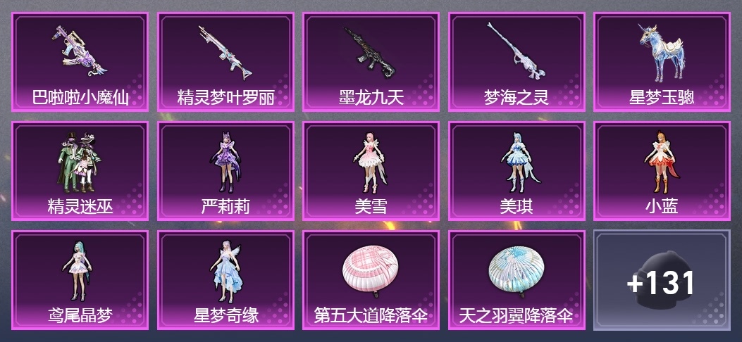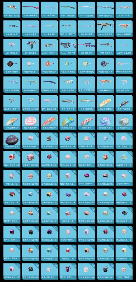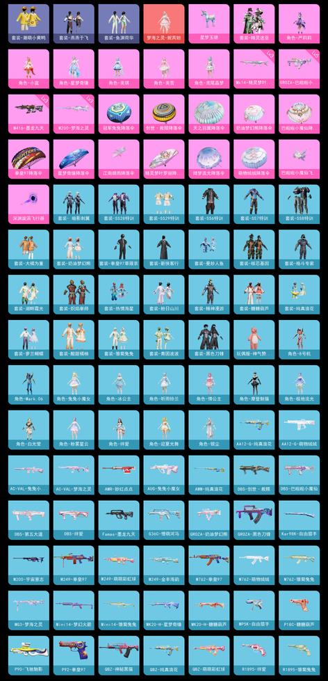 Mk14-精靈夢葉羅麗,GROZA-巴啦啦小魔仙,M416-墨龍九天,M200-夢海之靈,AA12-G-純真浪花,AA12-G-萌物絨絨,AC-VAL-兔兔小魔女,AC-VAL-夢海之靈,AMR-妙紅點點,AUG-兔兔小魔女,AWM-純真浪花,DBS-創世·救贖,DBS-巴啦啦小魔仙,DBS-第五大道,DBS-絆愛,Famas-墨龍九天,G36C-懵萌河馬,GROZA-奶油夢幻熊,GROZA-黑色刀鋒,Kar98K-自由獵手,M200-宇宙意志,M249-拳皇97,M249-萌萌彩虹球,M249-金豐海韻,M762-拳皇97,M762-萌物絨絨,M762-雛菊兔兔,MG3-夢海之靈,Mini14-夢幻火箭,Mini14-雛菊兔兔,MK20-H-星夢奇緣,MK20-H-糖糖葫蘆,MP5K-自由獵手,P18C-糖糖葫蘆,P90-飛馳魅影,P92-拳皇97,QBZ-神秘黑貓,QBZ-純真浪花,QBZ-萌萌彩虹球,R1895-絆愛,R1895-雛菊兔兔,R45-拳皇·狂花道,S1897-神秘黑貓,S1897-精靈夢葉羅麗,S1897-青蛇行歌,S686-千金淑貓,S686-魔法學院,SCAR-L-絆愛,SLR-墨龍九天,SLR-守護天翼,SLR-金豐海韻,SPAS-12-燕燕於飛,SVD-自由獵手,UMP45-春暖花開,UMP45-糖糖葫蘆,UZI-夢海之靈,UZI-魔法學院,Vector-燕燕於飛,Vector-黑色刀鋒,VSS-黑色刀鋒,十字弩-燕燕於飛,大砍刀-鳶尾晶夢,平底鍋-拳皇97,平底鍋-精靈夢葉羅麗,平底鍋-糖糖葫蘆,平底鍋-純真浪花,平底鍋-雛菊兔兔,平底鍋-黑色刀鋒,撬棍-巴啦啦小魔仙,湯姆遜-星夢奇緣,湯姆遜-純真浪花,短管霰彈-宇宙意志,蜜獾-白蛇盈舞,蜜獾-精靈夢葉羅麗,蜜獾-糖糖葫蘆,蠍式手槍-奶油夢幻熊,蠍式手槍-燕燕於飛,蠍式手槍-金豐海韻,野牛-奶油夢幻熊,野牛-燕燕於飛,野牛-雛菊兔兔