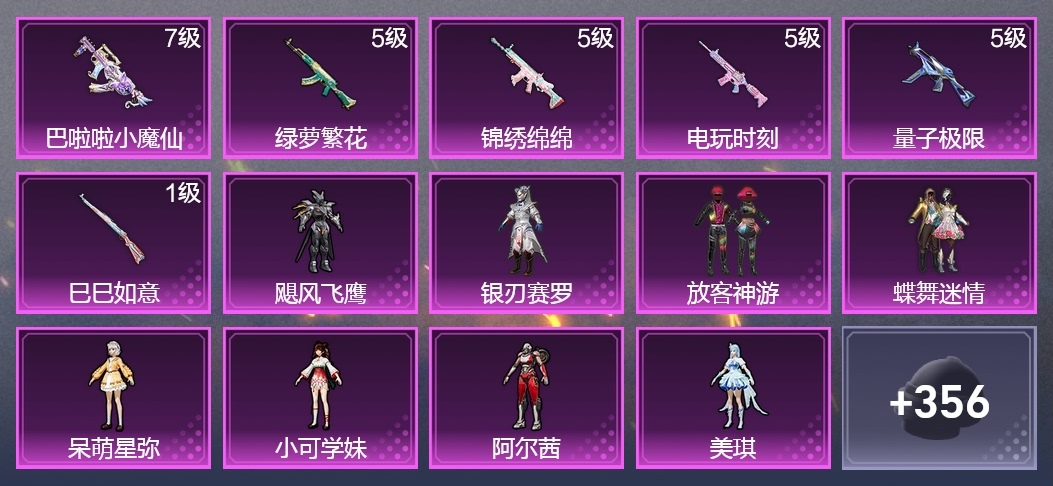AKM-綠蘿繁花,SCAR-L-錦繡綿綿,M416-電玩時刻,GROZA-巴啦啦小魔仙,Kar98K-巳巳如意,UMP45-量子極限,AKM-萌趣顏糰子,AKM-夜燈,AKM-破曉戰魂,AKM-霓虹街區,AKM-生命誓言,AKM-龍的傳人,AKM-彩虹符號,AKM-江南煙雨,AKM-影襲,AKM-虎虎生威,M16A4-幻世戰舞者,M16A4-生命誓言,M16A4-甜心亞夢,SCAR-L-玉兔迎春,SCAR-L-碧影閃光,SCAR-L-炫彩節奏,SCAR-L-暗夜玫瑰,SCAR-L-生命誓言,SCAR-L-海鹽豹豹,M416-紅色方程式,M416-藍色火焰,M416-糯團青竹,GROZA-治癒之星,GROZA-影襲,GROZA-異彩先驅,GROZA-田園牧歌,AUG-青春冒險家,QBZ-飛馳魅影,QBZ-洛神天依,QBZ-純真浪花,QBZ-彩虹符號,M762-生命誓言,M762-天降萌嘰,M762-瑞龍福將,Mk47-妙紅點點,Mk47-青春冒險家,Mk47-洛神天依,Mk47-烏木金紋,G36C-鏡域雙華,G36C-暗夜玫瑰,AC-VAL-快閃甜心,AC-VAL-甜心亞夢,AC-VAL-烏木金紋,AC-VAL-天降萌嘰,蜜獾-天降萌嘰,蜜獾-嬌憨豬豬,Famas-鏡域雙華,Kar98K-彩虹符號,Kar98K-頂峰精英,Kar98K-影襲,Kar98K-洛神天依,Kar98K-飛馳魅影,Kar98K-紅色方程式,Kar98K-王子的夏天,Kar98K-炫彩節奏,M24-炫彩節奏,M24-影襲,M24-櫻桃泡泡,M24-治癒之星,AWM-焰鷹斗篷,AWM-純真浪花,AWM-恐龍拽拽,Win94-瑞龍福將,莫辛納甘-炙焰牛王,莫辛納甘-烏木金紋,AMR-白勺歌姬,AMR-妙紅點點,AMR-鬼刀,M200-仲夏莫吉托,M200-驚鴻俠骨,SKS-炫彩節奏,SKS-迅猛狂鯊,SKS-夜燈,SKS-糯團青竹,VSS-田園牧歌,VSS-香桃花海,VSS-彩虹符號,VSS-碧影閃光,Mini14-香桃花海,Mini14-炫彩節奏,Mini14-春暖花開,Mini14-異彩先驅,Mini14-塗山之戀,Mk14-烏木金紋,Mk14-治癒之星,SLR-嬌憨豬豬,SLR-彩虹符號,QBU-青春冒險家,QBU-颯粉甜心,QBU-全功率超戰,M417-驚鴻俠骨,MK20-H-快閃甜心,UZI-啾咪啾咪,UZI-炫彩節奏,UZI-天降萌嘰,UZI-嬌憨豬豬,UZI-影襲,UMP45-夜燈,UMP45-仲夏莫吉托,UMP45-藍色火焰,Vector-治癒之星,Vector-彩虹符號,Vector-燕燕於飛,Vector-田園牧歌,Vector-生命誓言,Vector-焰鷹斗篷,湯姆遜-環太平洋,湯姆遜-異彩先驅,湯姆遜-純真浪花,湯姆遜-天降萌嘰,野牛-燕燕於飛,野牛-青春冒險家,MP5K-異彩先驅,AKS-74U-鬼刀,P90-玩趣呆呆,P90-飛馳魅影,P90-快閃甜心,S686-生命誓言,S686-彩虹符號,S686-紅色方程式,S1897-炫彩節奏,S1897-春暖花開,S1897-飛馳魅影,S12K-瑞龍福將,S12K-嬌憨豬豬,S12K-玩趣呆呆,S12K-破曉戰魂,S12K-垂柳戲鴨,S12K-幻世戰舞者,DBS-焰鷹斗篷,DBS-甜心亞夢,DBS-巴啦啦小魔仙,AA12-G-純真浪花,SPAS-12-田園牧歌,SPAS-12-燕燕於飛,M249-妙紅點點,M249-糯團青竹,M249-彩虹符號,DP-28-焰鷹斗篷,DP-28-甜心亞夢,MG3-妙紅點點,MG3-幻世戰舞者,MG3-驚鴻俠骨,MG3-瑞龍福將,MG3-烏木金紋,P1911-創世·救贖,蠍式手槍-燕燕於飛,沙漠之鷹-快閃甜心,大砍刀-鬼刀,撬棍-幻世戰舞者,撬棍-環太平洋,平底鍋-空投萌嘰,平底鍋-激戰未來,平底鍋-瑞龍福將,平底鍋-驚鴻俠骨,平底鍋-焰鷹斗篷,平底鍋-異彩先驅,平底鍋-田園牧歌,平底鍋-純真浪花,平底鍋-飛行日記,平底鍋-甜心亞夢,平底鍋-空島之星,平底鍋-飛馳魅影,平底鍋-光之冒險,平底鍋-治癒之星,平底鍋-妙紅點點,平底鍋-青春冒險家,平底鍋-快閃甜心,平底鍋-嬌憨豬豬,十字弩-燕燕於飛,戰術弩-江南煙雨,爆炸獵弓-驚鴻俠骨,破片手榴彈-星途旅人,破片手榴彈-呆爆全場