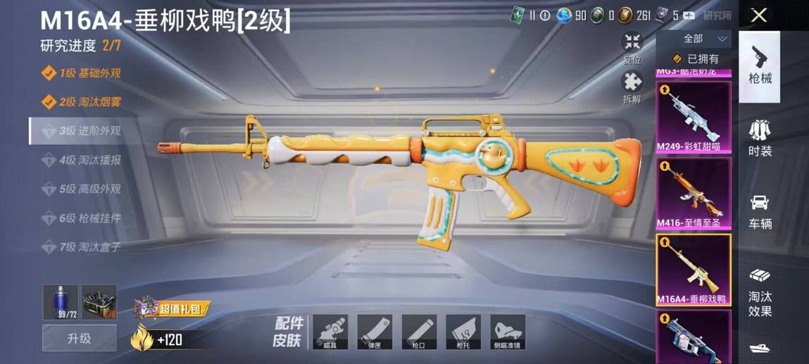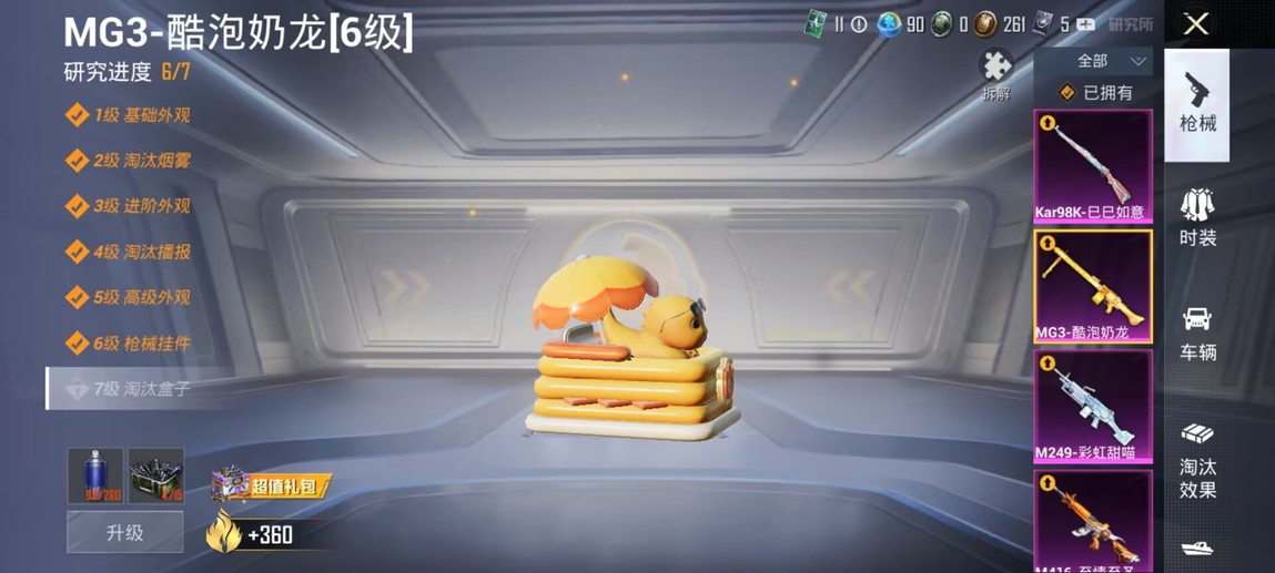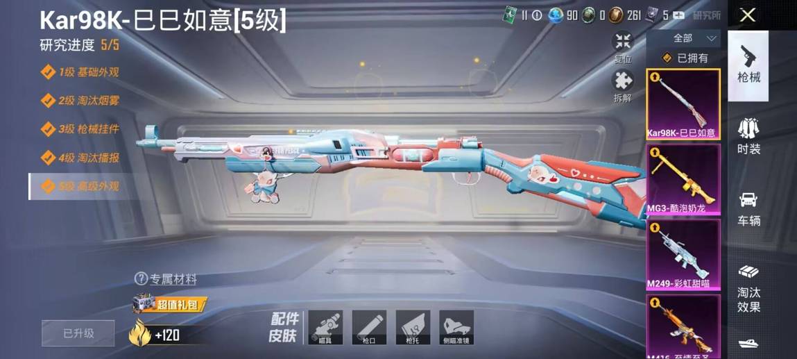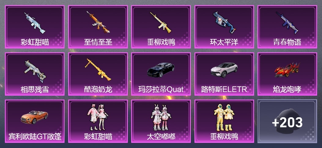 M16A4-垂柳戲鴨,SCAR-L-青春物語,M416-至情至聖,UMP45-相思殘雪,Vector-環太平洋,DBS-創世·救贖,M249-彩虹甜喵,MG3-酷泡奶龍,AKM-環太平洋,AKM-萌趣顏糰子,M16A4-甜心亞夢,SCAR-L-流星咚咚,M416-緋紅前夜,GROZA-異彩先驅,GROZA-田園牧歌,AUG-耀粉歌者,AUG-閒夢青纓,AUG-青春冒險家,QBZ-妙趣可麗,QBZ-電玩視界,QBZ-飛馳魅影,M762-奇異狩獵者,M762-彩虹甜喵,M762-瑞龍福將,M762-甜心寶貝,M762-鐳射皇者,Mk47-粉色回憶,Mk47-青春冒險家,G36C-時空追擊者,AC-VAL-彩虹甜喵,AC-VAL-快閃甜心,AC-VAL-甜心亞夢,AC-VAL-閒夢青纓,蜜獾-垂柳戲鴨,蜜獾-嬌憨豬豬,UZI-嬌憨豬豬,UMP45-時空追擊者,UMP45-炫光之旅,Vector-焰鷹斗篷,Vector-PEL轟鳴競夢者,Vector-田園牧歌,湯姆遜-奇異狩獵者,湯姆遜-異彩先驅,湯姆遜-環太平洋,湯姆遜-耀粉歌者,野牛-青春冒險家,MP5K-異彩先驅,P90-快閃甜心,P90-甜蜜旋律,P90-飛馳魅影,Kar98K-飛馳魅影,AWM-焰鷹斗篷,AWM-垂柳戲鴨,AWM-恐龍拽拽,AWM-炙焰牛王,AWM-颯粉甜心,SKS-時空追擊者,VSS-星之彼岸,VSS-田園牧歌,VSS-鐳射皇者,Mini14-異彩先驅,Mini14-旋轉彩虹,Mini14-夢幻火箭,Mini14-穿刺龍蝦,Mini14-築夢精靈,Mini14-耀粉歌者,Mini14-阿狸紅,Win94-夏日綿綿冰,Win94-瑞龍福將,SLR-嬌憨豬豬,QBU-錦繡火鯉,QBU-青春冒險家,QBU-颯粉甜心,M417-驚鴻俠骨,MK20-H-快閃甜心,MK20-H-蓮影清波,M200-驚鴻俠骨,S686-奇異狩獵者,S686-靈感創作師,S1897-鐳射皇者,S1897-飛馳魅影,S12K-瑞龍福將,S12K-垂柳戲鴨,S12K-嬌憨豬豬,S12K-暖熊萌萌,DBS-焰鷹斗篷,DBS-彩虹甜喵,DBS-時空追擊者,DBS-甜心亞夢,SPAS-12-田園牧歌,M249-四聖煥新,M249-星之彼岸,M249-鐳射皇者,DP-28-焰鷹斗篷,DP-28-甜心亞夢,DP-28-錦繡火鯉,DP-28-閃光銀龍,MG3-驚鴻俠骨,MG3-暗夜行者,MG3-瑞龍福將,MG3-青春物語