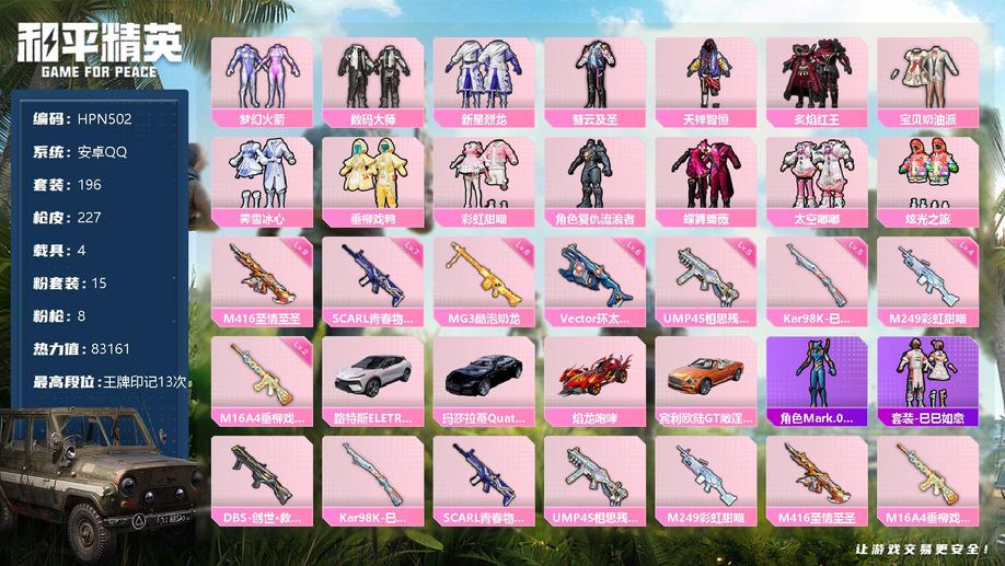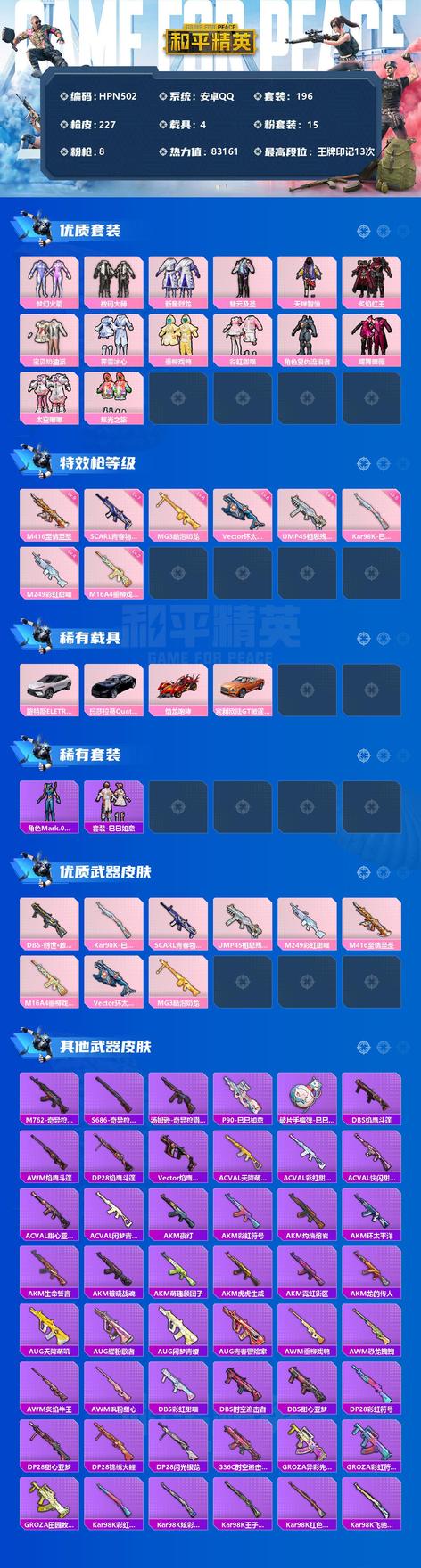 【商品標題】:安卓 手Q-15粉裝-8特效槍-4載具-83161熱力值-0印記-196套裝-227槍皮
