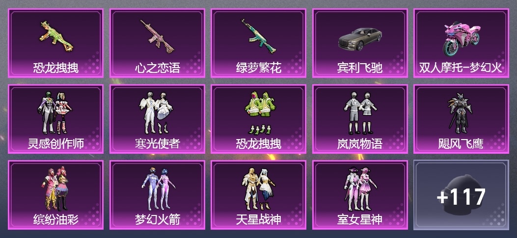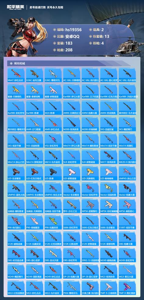 AKM-繽紛海域,M416-心之戀語,UMP45-恐龍拽拽,DBS-時空追擊者,DBS-聖光天使,AKM-環太平洋,Kar98K-夢幻火箭,M16A4-甜心亞夢,Kar98K-影襲,GROZA-田園牧歌,GROZA-恐龍拽拽,GROZA-懵萌河馬,AUG-耀粉歌者,M24-影襲,Mk47-妙紅點點,G36C-懵萌河馬,AWM-王牌四分衛,AC-VAL-甜心亞夢,蜜獾-垂柳戲鴨,蜜獾-嬌憨豬豬,MG3-第五大道,AWM-恐龍拽拽,莫辛納甘-懵萌河馬,AMR-妙紅點點,M200-驚鴻俠骨,VSS-田園牧歌,AMR-白勺歌姬,MP5K-彩虹嘻嘻猴,SKS-迅猛狂鯊,M416-緋紅前夜,SLR-嬌憨豬豬,M762-緋紅前夜,M417-驚鴻俠骨,UZI-嬌憨豬豬,P90-快閃甜心,M249-蓮影清波,Vector-田園牧歌,Mini14-夢幻火箭,QBZ-銀河戰甲,Mini14-耀粉歌者,S12K-垂柳戲鴨,湯姆遜-耀粉歌者,S12K-嬌憨豬豬,S12K-幻影戰神,SCAR-L-甜蜜旋律,DBS-甜心亞夢,SPAS-12-田園牧歌,Mini14-阿狸紅,QBZ-未來歌姬,M249-妙紅點點,DP-28-甜心亞夢,MG3-妙紅點點,Mini14-穿刺龍蝦,MG3-驚鴻俠骨,PKM-懵萌河馬,AC-VAL-快閃甜心,Kar98K-2B戰鬥服款,AKM-恐龍拽拽,MP5K-颯粉甜心,AKM-影襲,UZI-影襲,SCAR-L-甜蜜誓約,AKM-綠蘿繁花,GROZA-影襲,AUG-冰川粉黛,AUG-炫光貝貝,MP5K-甜蜜誓約,MK20-H-快閃甜心,SCAR-L-是愛神辣,G36C-金風玉露