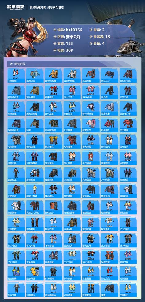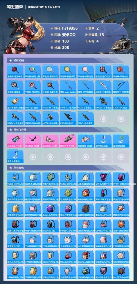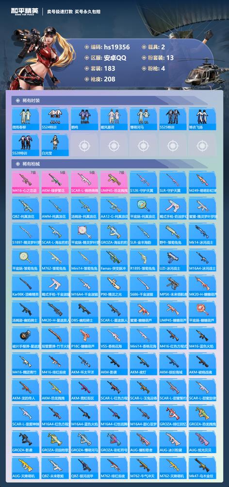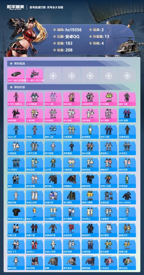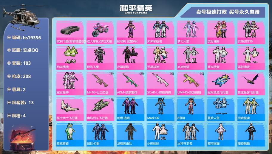 617-hs 安卓手-11王牌印記-有戰神框-13粉裝-4特效槍-2載具-熱力值-183套裝-208槍皮-5卓越印記-2傳奇印記 〖13粉裝〗,初號機 覺醒Ver.,未來領航者,夢幻火箭,繽紛油彩,靈感創作師,恐龍拽拽,颶風飛鷹,夜幕頌歌,天星戰神,嵐嵐物語,寒光使者,蓮影清波,室女星神 〖4特效槍〗AKM-綠蘿繁花-5級 SCAR-L-錦繡綿綿-5級 M416-心之戀語-7級 UMP45-恐龍