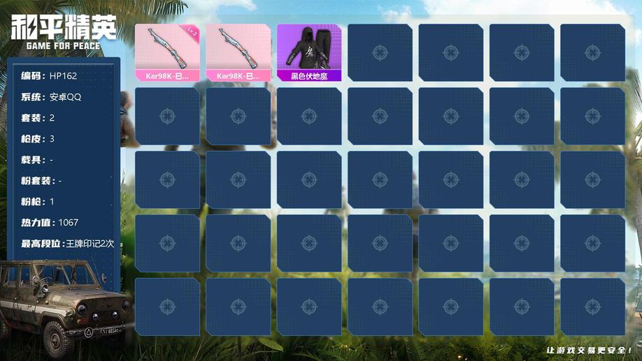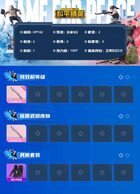 【商品標題】:安卓 手Q-0粉裝-1特效槍-0載具-1067熱力值--2印記-2套裝-3槍皮