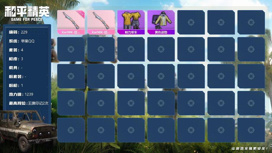 229-【商品標題】:蘋果 手Q-0粉裝-1特效槍-0載具-1239熱力值--2印記-4套裝-3槍皮