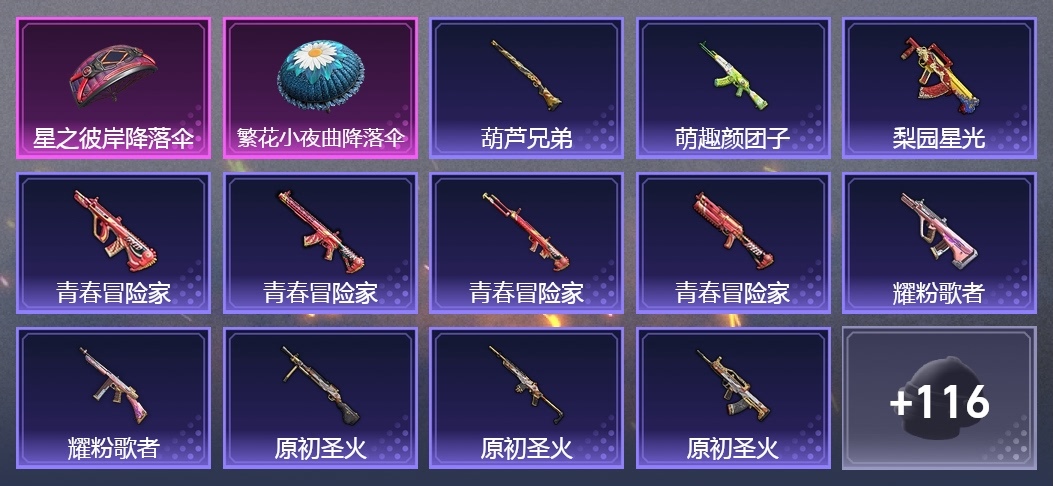 AKM-虎虎生威,AKM-灼熱熔岩,AKM-夜燈,AKM-萌趣顏糰子,AKM-生命誓言,AKM-破曉戰魂,M16A4-幻世戰舞者,M16A4-藍色火焰,M16A4-機械英豪,SCAR-L-玉兔迎春,SCAR-L-紅色方程式,SCAR-L-炫彩節奏,M416-藍色火焰,M416-緋紅前夜,GROZA-梨園星光,AUG-青春冒險家,AUG-耀粉歌者,QBZ-原初聖火,QBZ-彩虹符號,M762-牛氣沖天,M762-緋紅前夜,Mk47-青春冒險家,Kar98K-紅色方程式,Kar98K-彩虹符號,Kar98K-炫彩節奏,Win94-機械英豪,SKS-炫彩節奏,Mini14-金鼠迎春,Mini14-原初聖火,Mini14-香桃花海,Mini14-炫彩節奏,Mk14-烏木金紋,QBU-青春冒險家,UZI-炫彩節奏,UZI-紅色方程式,UMP45-藍色火焰,UMP45-生命誓言,Vector-彩虹符號,Vector-生命誓言,湯姆遜-耀粉歌者,野牛-青春冒險家,野牛-機械英豪,S686-葫蘆兄弟,S686-紅色方程式,S1897-神秘黑貓,S12K-破曉戰魂,S12K-機械英豪,M249-破曉戰魂,DP-28-原初聖火,DP-28-彩虹符號,MG3-幻世戰舞者,P1911-創世·救贖,P18C-原初聖火,撬棍-緋紅前夜,平底鍋-原初聖火,平底鍋-青春冒險家,平底鍋-飛行日記,平底鍋-機械英豪,破片手榴彈-萌趣顏糰子
